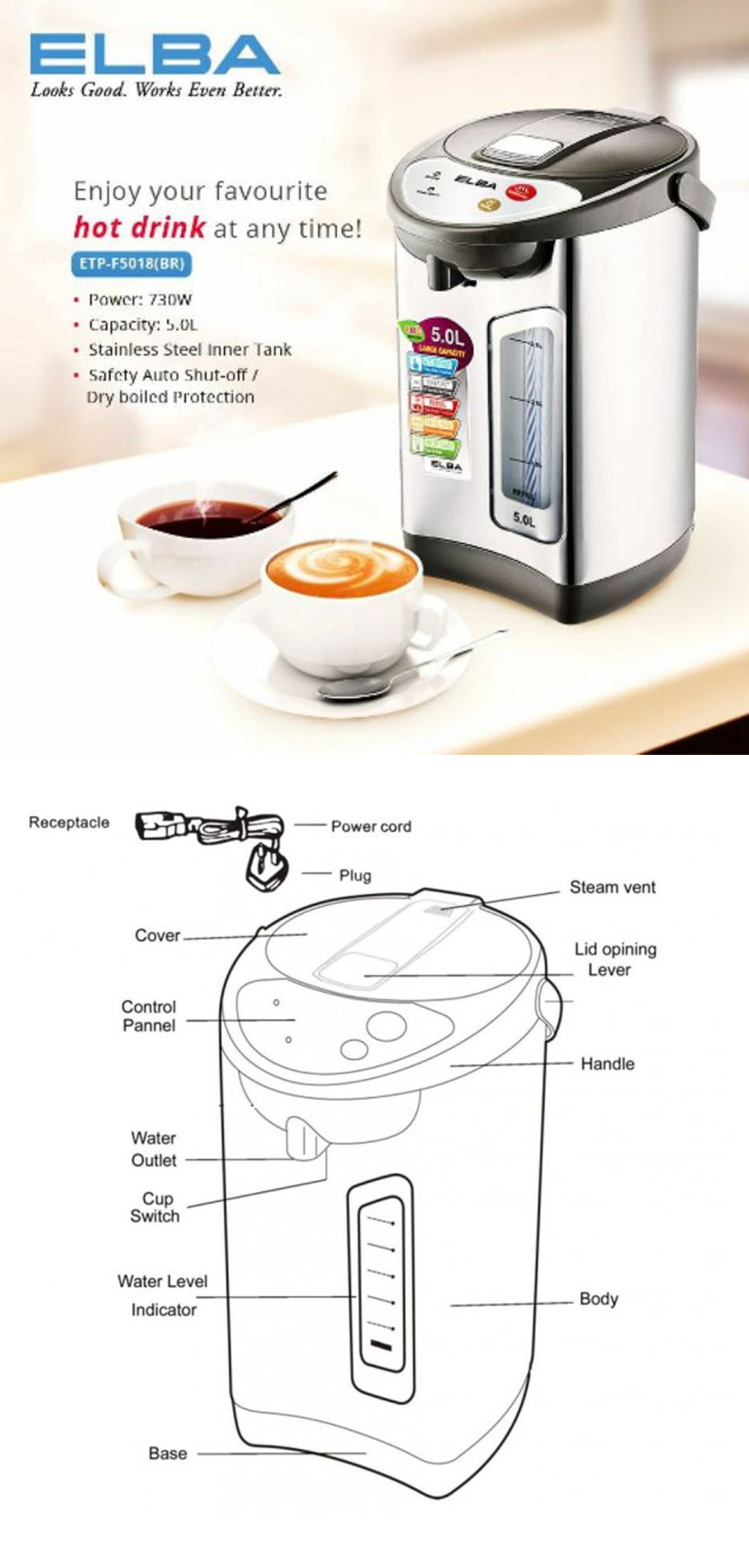 ELBA 5L Thermopot ETP-F5018(BR) | Dry-boiled Protection | 304 Stainless Steel Inner Pot | Auto Reboil | Thermo Pot with 1 Year Warranty