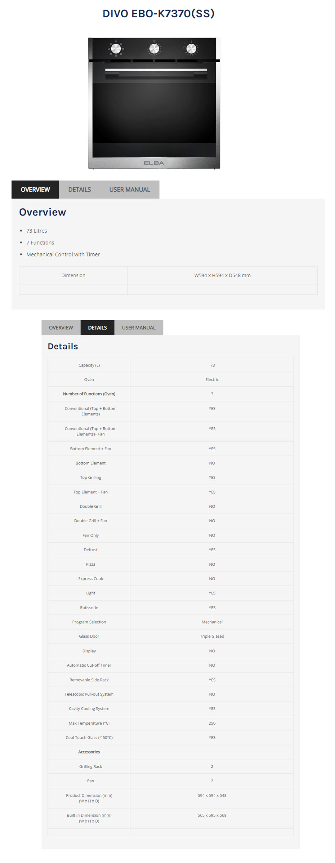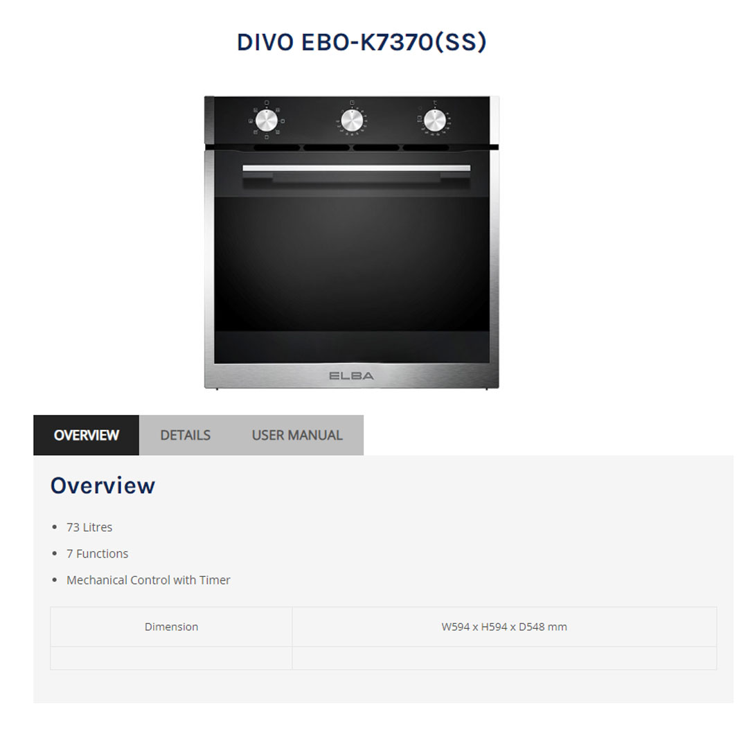 ELBA 73L Built-in Oven DIVO EBO-K7370(SS) | 7 Functions | Mechanical Control with Timer | Triple Glazed Glass Door | Oven with 1 Year Warranty