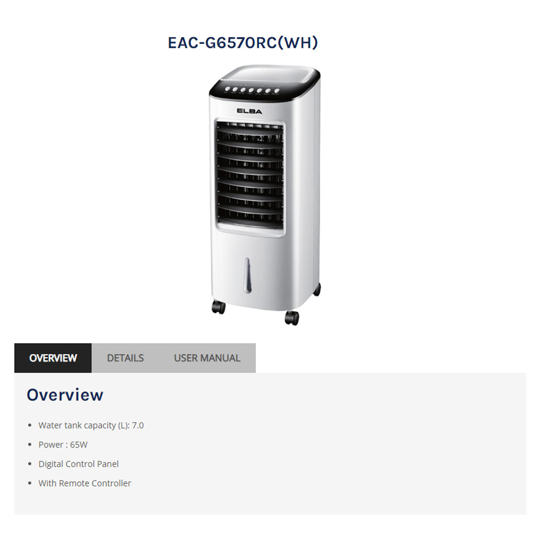 ELBA 7L Air Cooler EAC-G6570RC(WH) | Digital Control Panel | With Remote Controller | 3-speed Fan Settings | Air Cooler with 1 Year Warranty