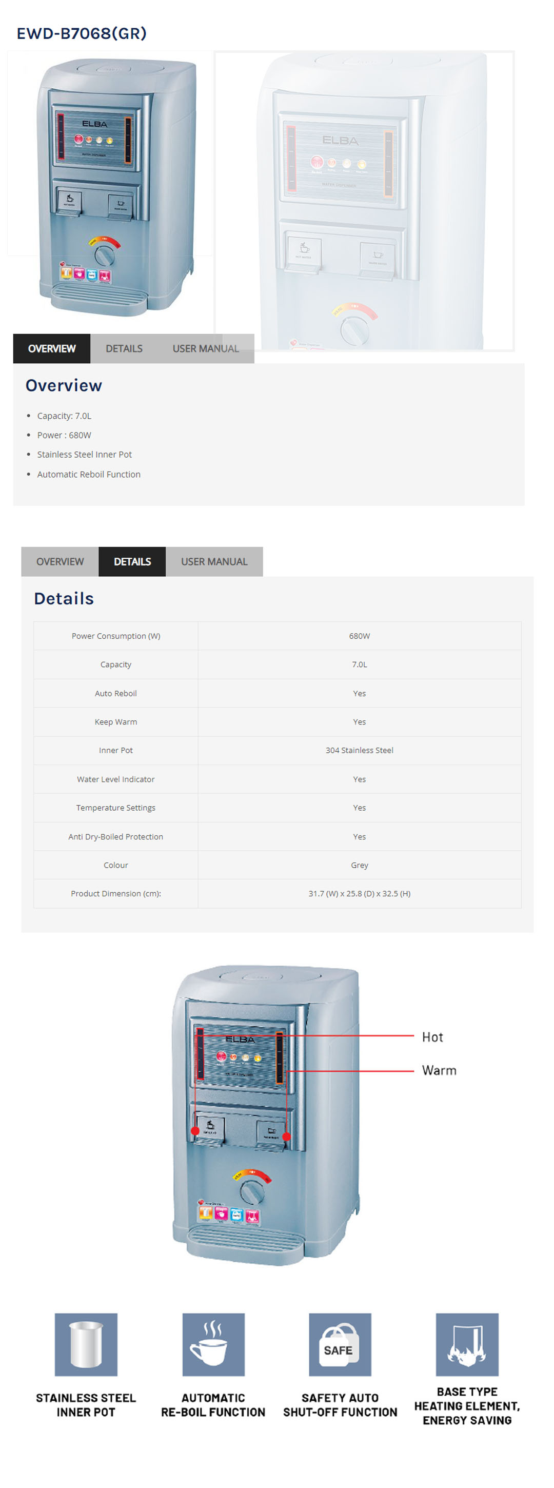 ELBA 7L Water Dispenser EWD-B7068(GR) | Stainless Steel Inner Pot | Automatic Reboil Function | Anti Dry-Boiled Protection | Water Dispenser with 1 Year Warranty