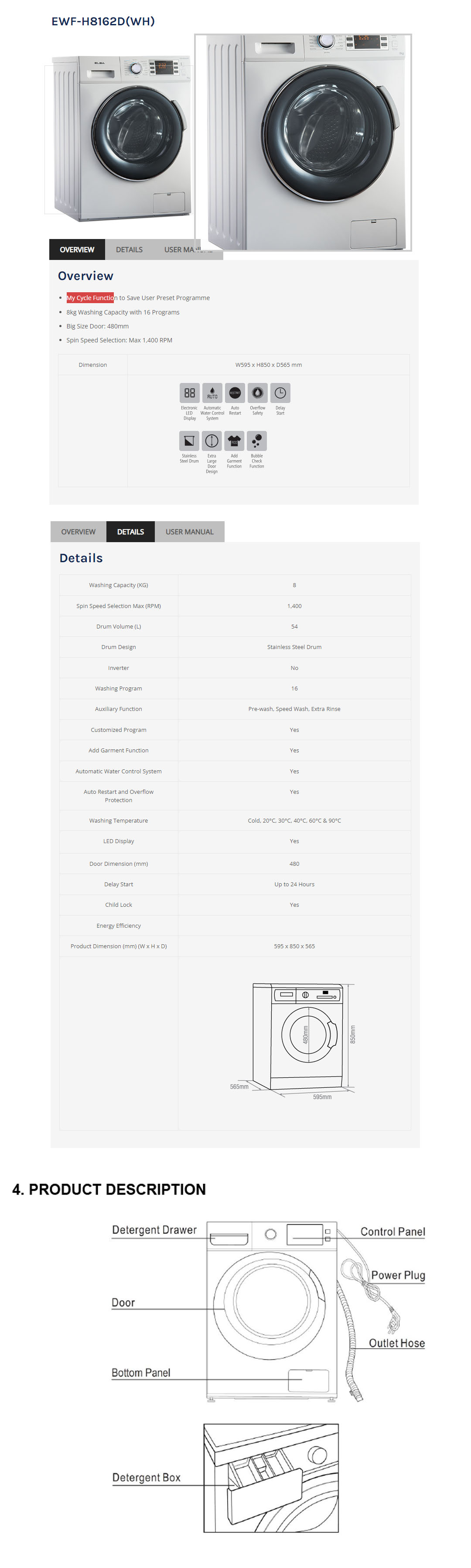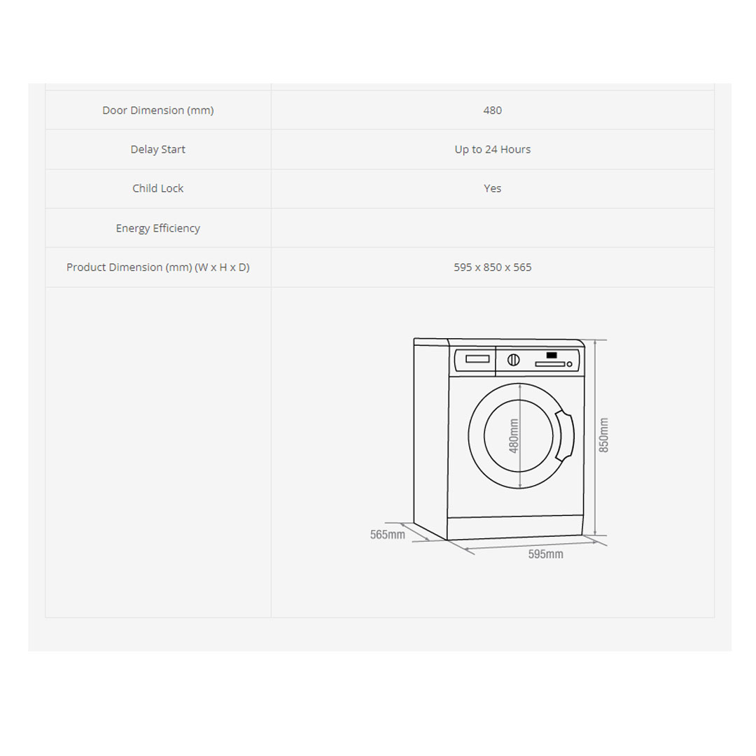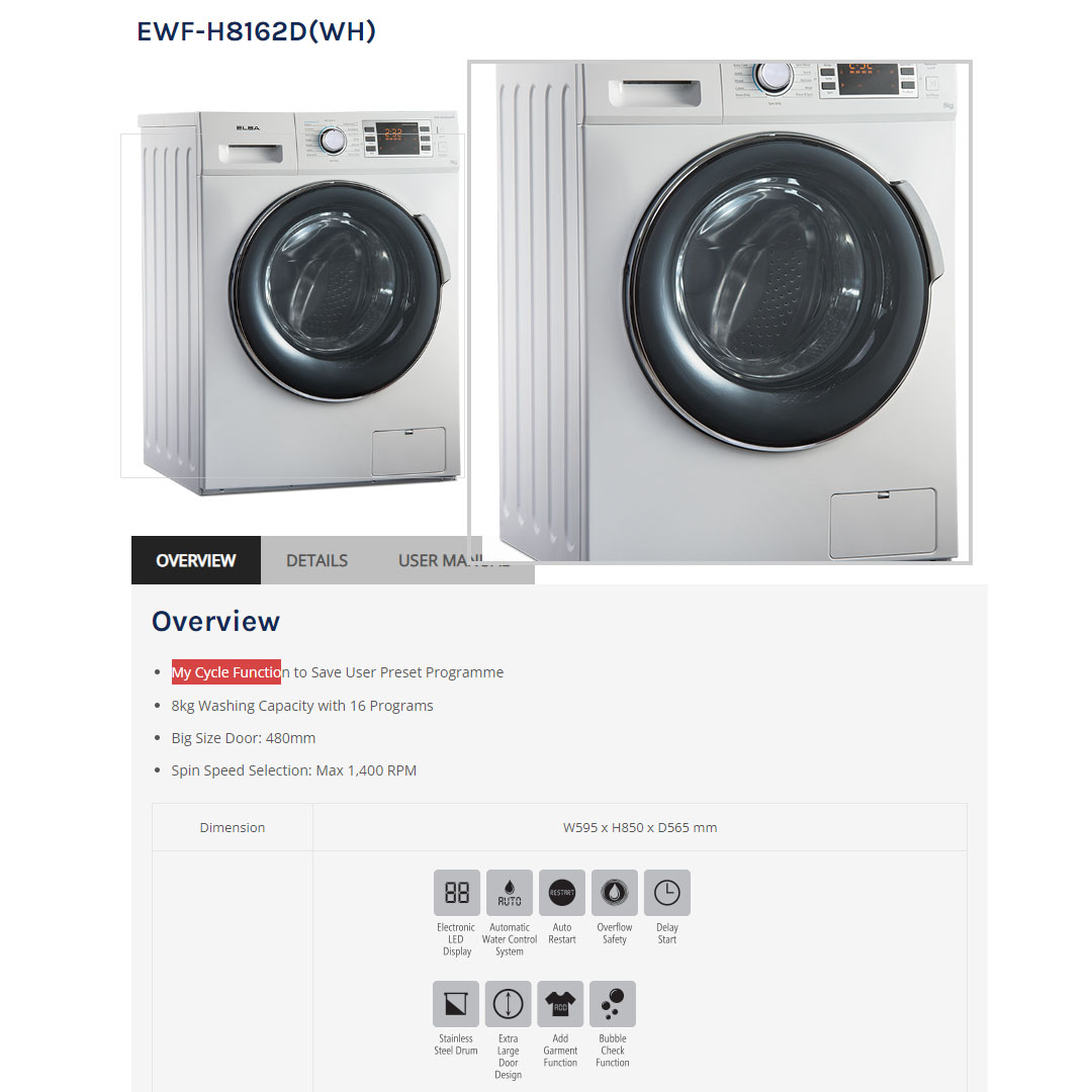 ELBA 8KG Front Load Washing Machine EWF-H8162D(WH) | 16 Programs | My Cycle Function to Save User Preset Program | Auxiliary Function | washing Machine with 1 Year General Warranty, 1 Year Panel Warranty & 10 Years Motor Warranty