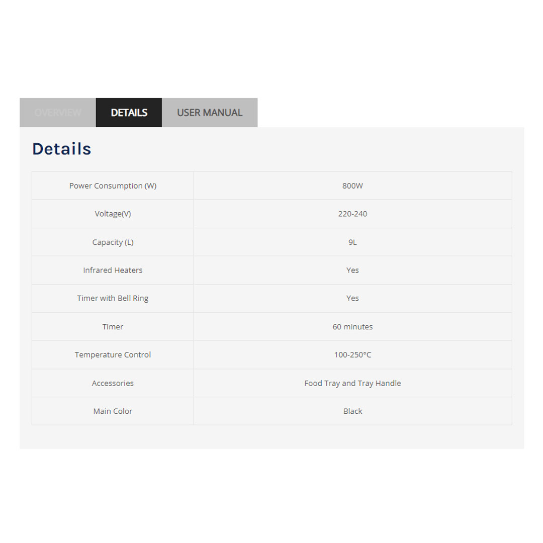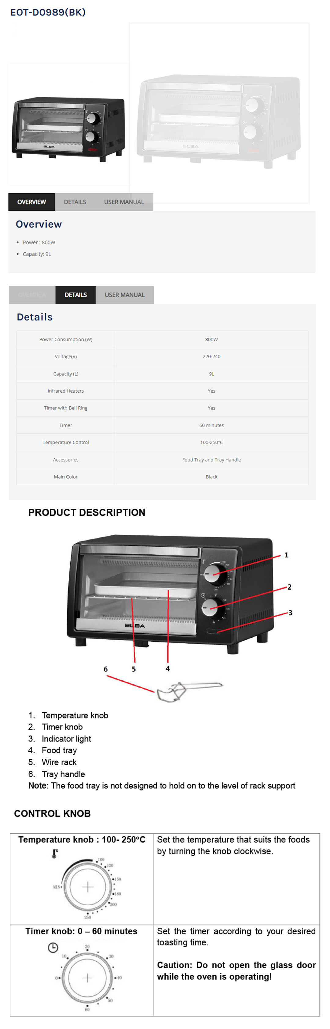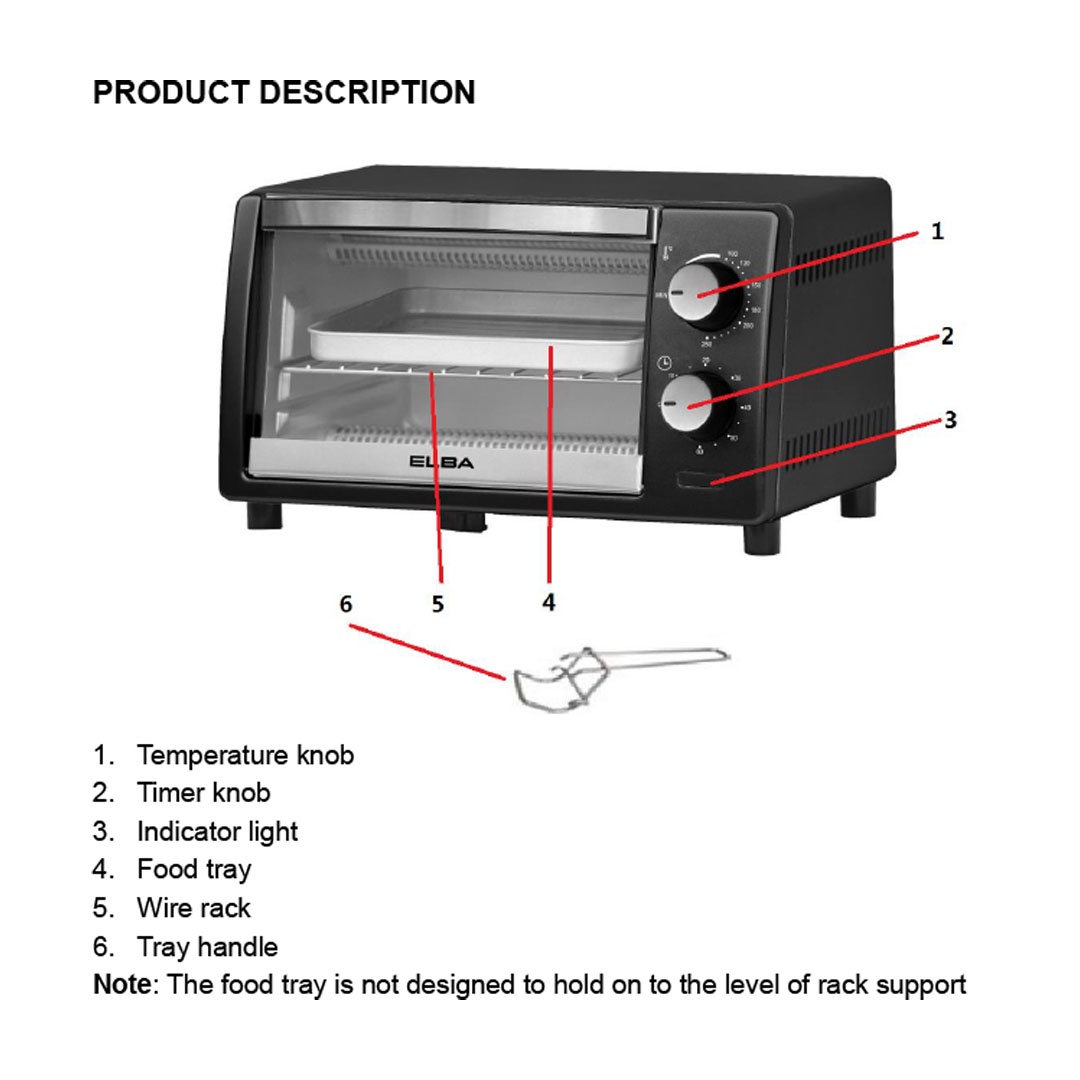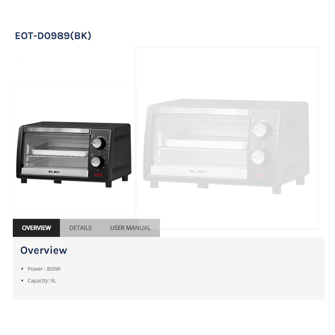 ELBA 9L Oven Toaster EOT-D0989(BK) | Infrared Heaters | Timer with Bell Ring | Included Food Tray and Tray Handle | Oven Toaster with 1 Year Warranty