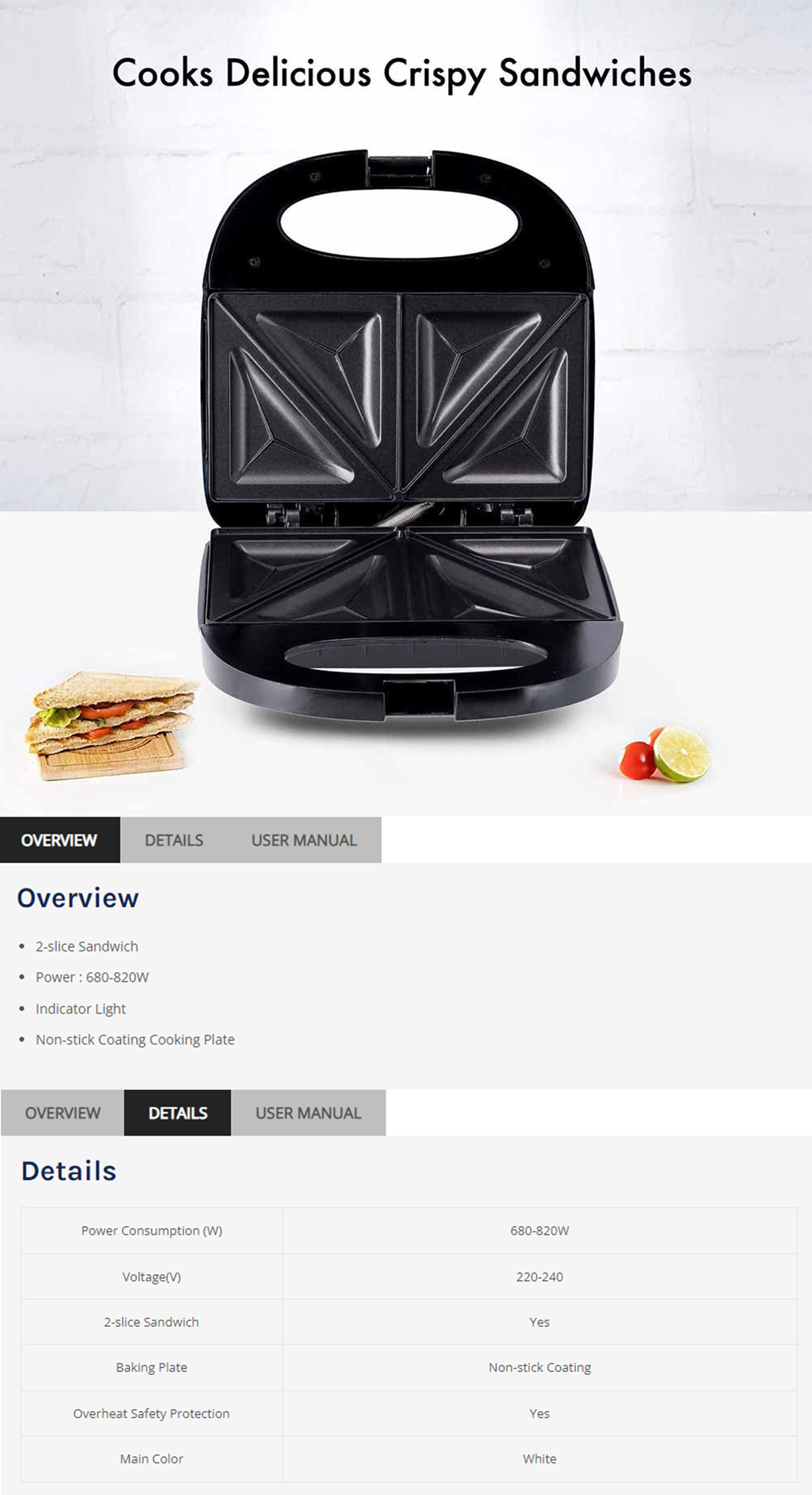 ELBA Sandwich Maker ESM-G7021(WH) | Non-stick Coating Cooking Plate | Overheat Safety Protection | Indicator Light | 2-slice Sandwich | Sandwich Maker with 1 Year Warranty
