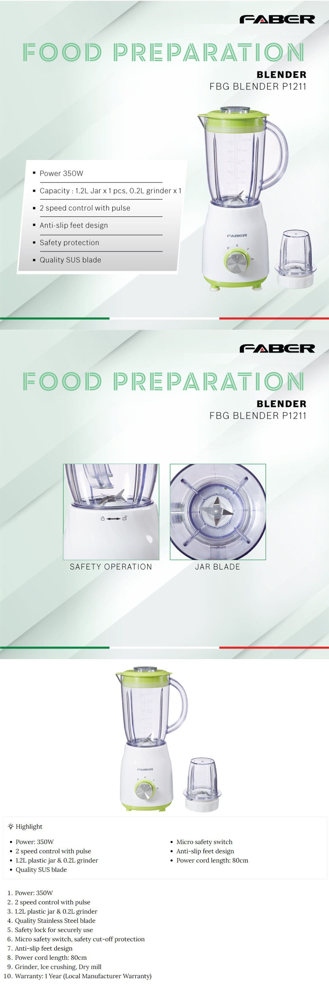 FABER 1.2L Blender FBG BLENDY P1211 | 2 Speed Control With Pulse | 1.2L Plastic Jar & 0.2L Grinder | Quality SUS Blade | Blender with 1 Year Warranty