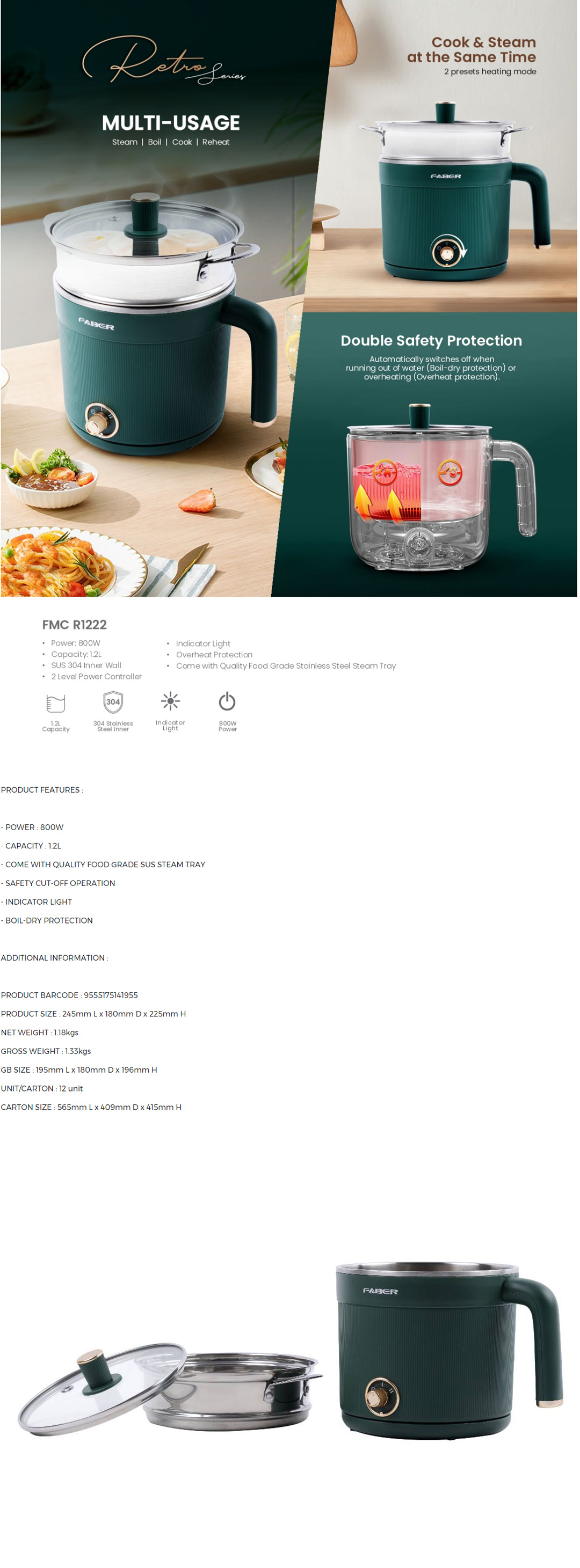 FABER 1.2L Retro Series Handy Multi Cooker FMC R1222 | Boil-Dry Protection | Safety Cut-Off Operation | Indicator Light | Multi Cooker with 1 Year Warranty