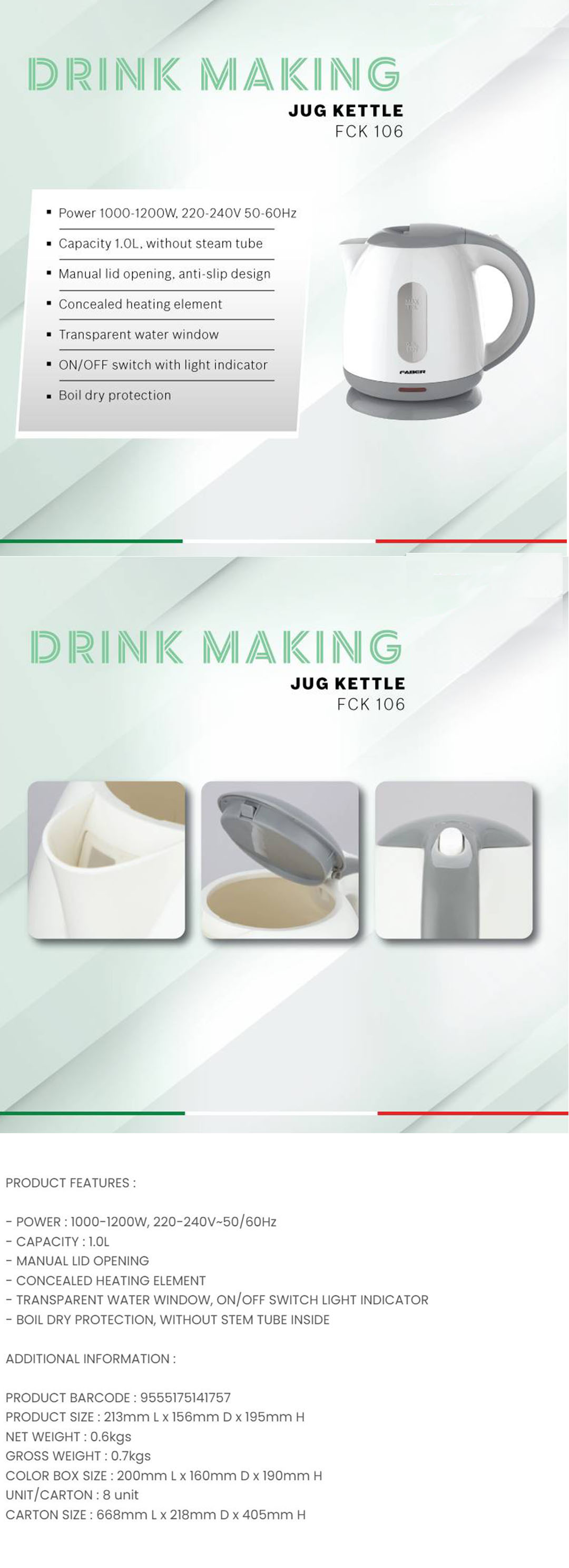 FABER 1L Kettle FCK 106 | Manual Lid Opening | Concealed Heating Element | Boil Dry Protection | Kettle with 1 Year Warranty