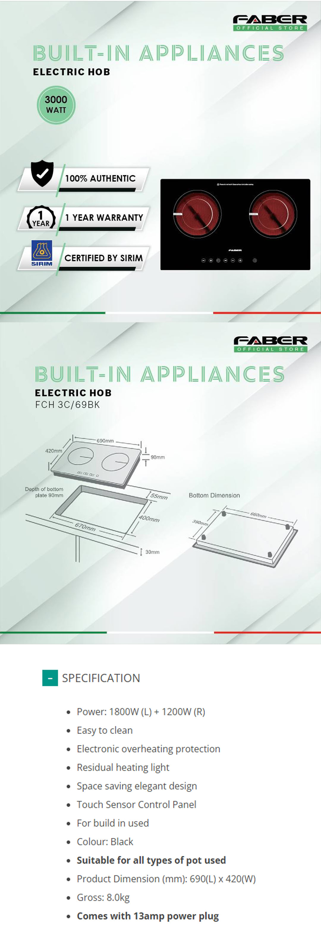 FABER 2 Burners Built-In Ceramic Hob FCH3C/69BK | Touch Sensor Control Panel | Easy to clean | Electronic overheating protection | Ceramic Hob with 1 Year Warranty