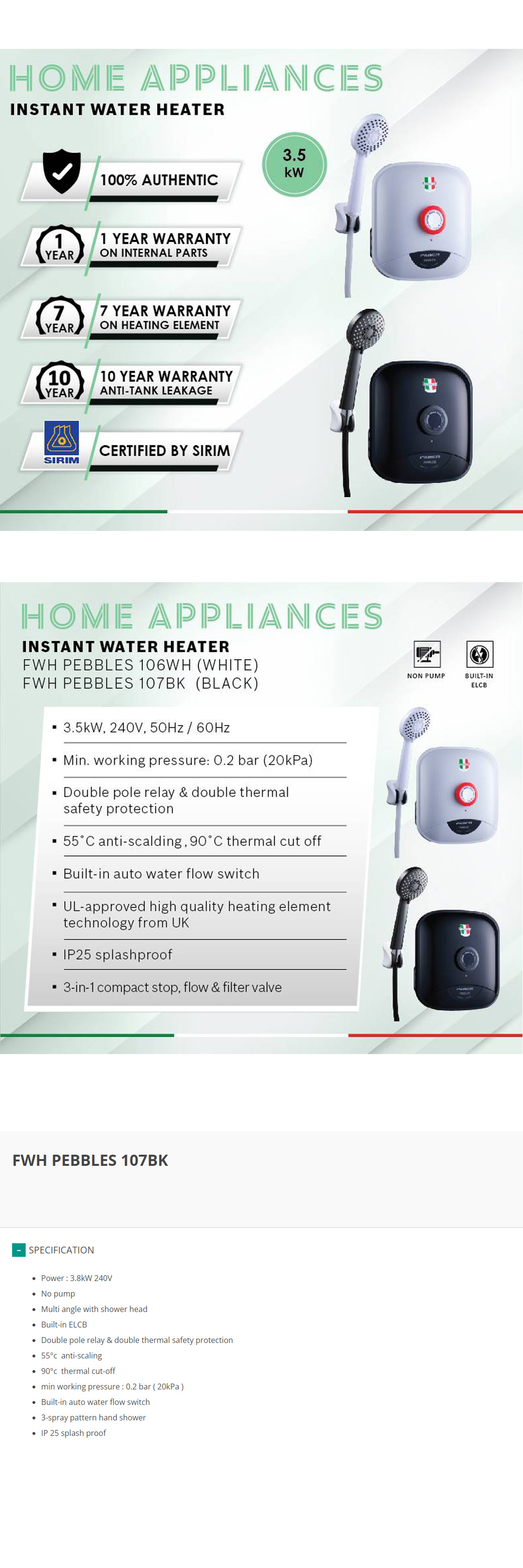 FABER 3800W Non Pump Water Heater FWH PEBBLES 106WH | Built-in ELCB | 3-Spray Pattern Hand Shower | IP25 Splash Proof | Double Thermal Safety Protection | Water Heater with 1 Year Warranty