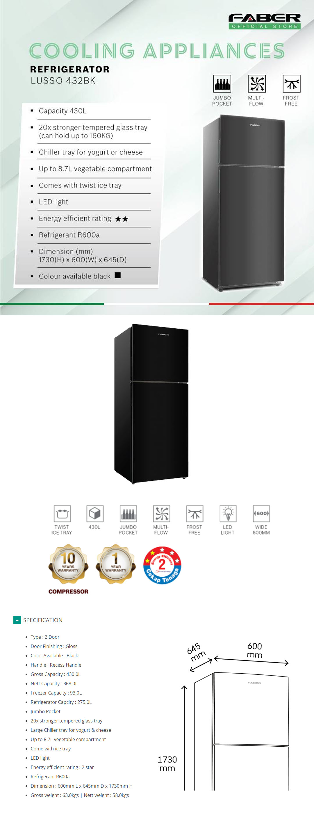 FABER 430L 2 Doors Refrigerator LUSSO 432BK | 20x Stronger Tempered Glass Tray | Refrigerant R600a | Fridge with 1 Year Warranty & Compressor with 10 Years Warranty