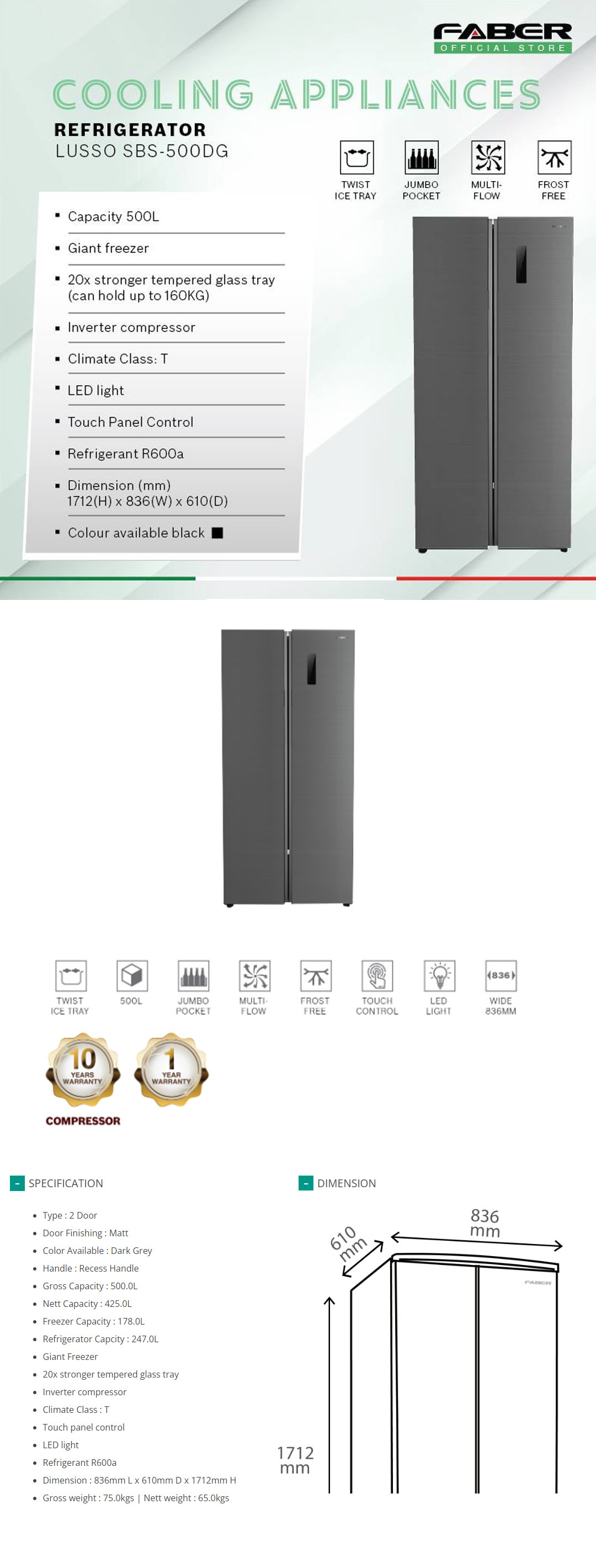 FABER 500L Side By Side Doors Inverter Refrigerator LUSSO SBS-500DG | 20x Stronger Tempered Glass Tray | Refrigerant R600a | Fridge with 1 Year Warranty & Compressor with 10 Years Warranty