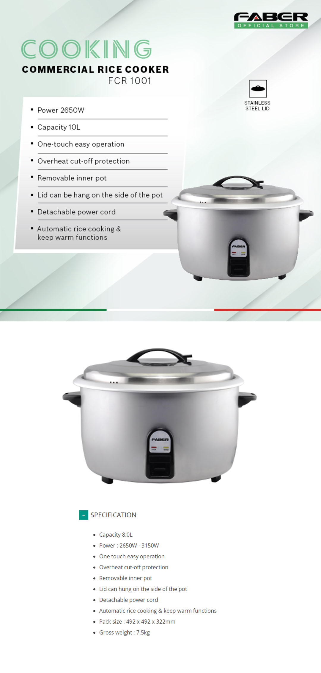 FABER 8L Rice Cooker FCR 801 | One Touch Easy Operation | Overheat cut-off Protection | Automatic Rice Cooking & Keep Warm Functions | Rice Cooker with 1 Year Warranty