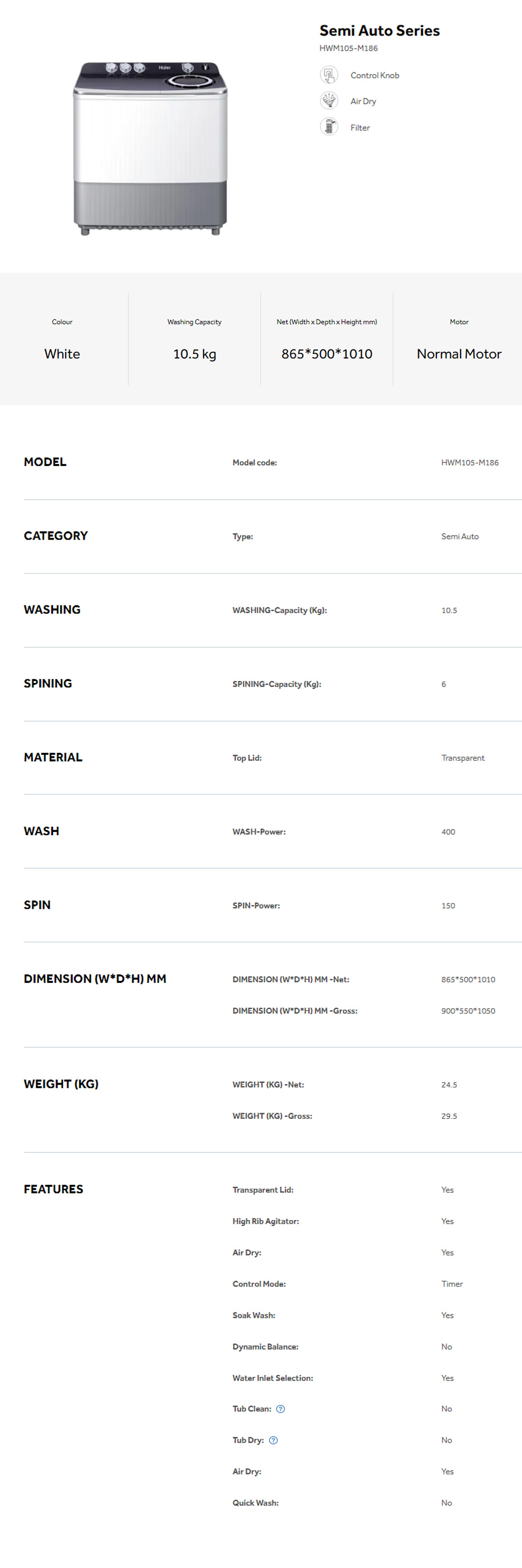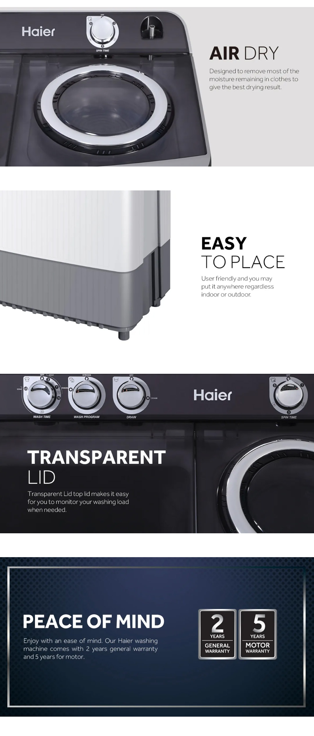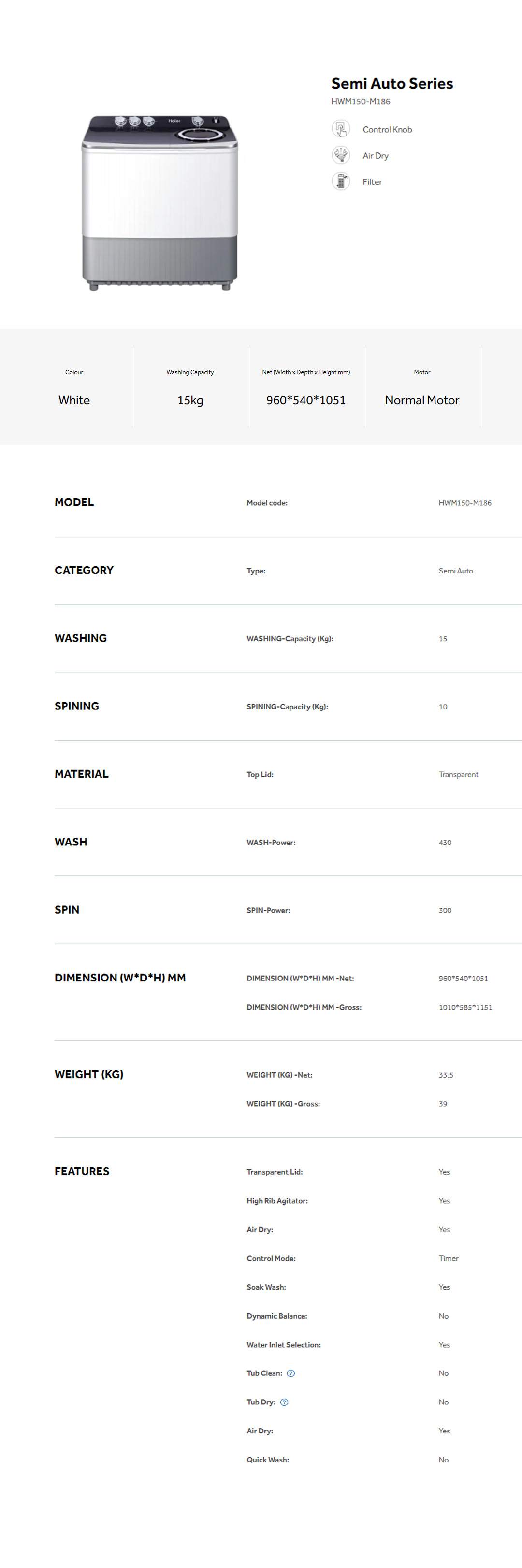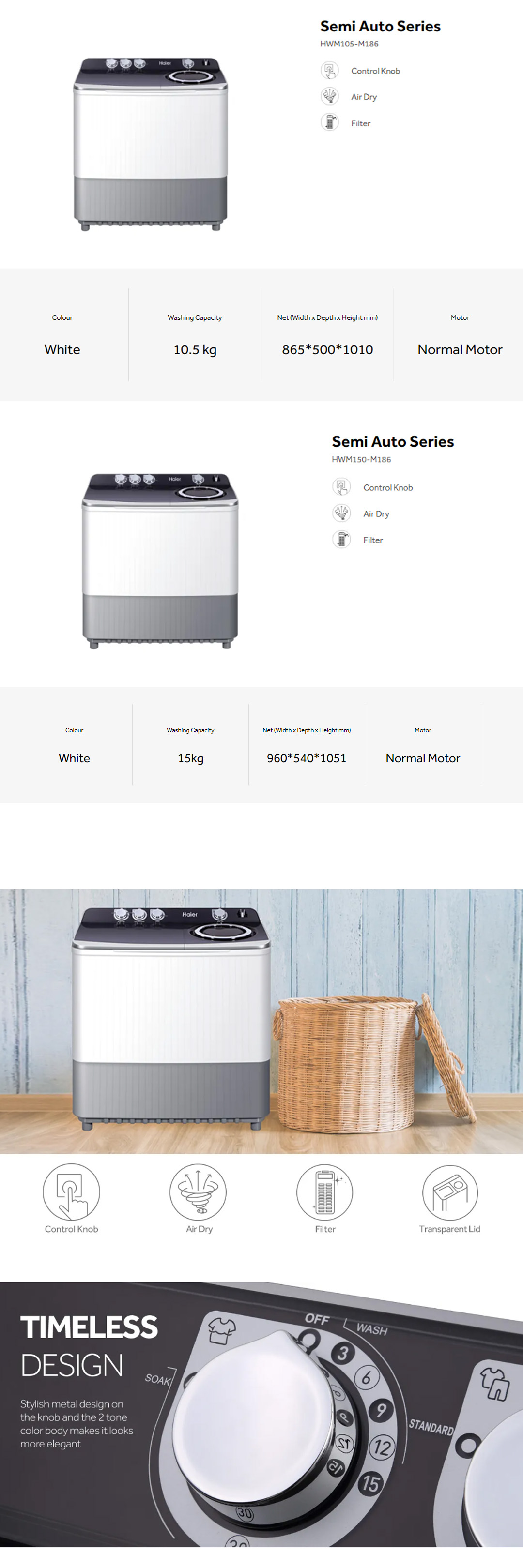 HAIER 10.5KG/15KG Semi Auto Washing Machine HWM105-M186/HWM150-M186 | High Rib Agitator | Water Inlet Selection | Soak Wash | Air Dry | Transparent Lid | Easy Clean Filter | Washing Machine with 2 Year Warranty