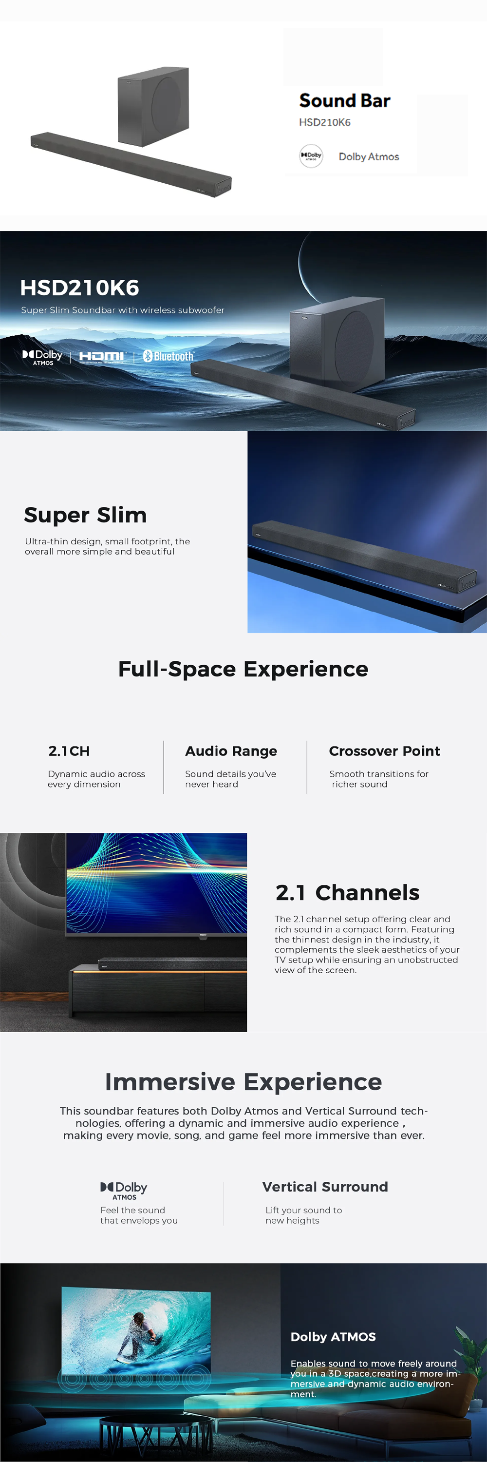 HAIER 120W Sound Bar HSD210K6 | 2.1 Dolby Atmos | HDMI/Bluetooth Connection | Super Slim | Multi Mode Control