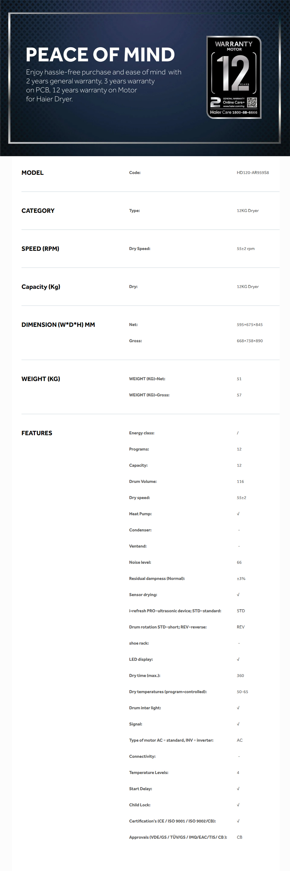 HAIER 12KG Heat Pump Dryer HD120-AR959S8 | Reversible Tumble | Sensor Dry | Heat Pump Technology