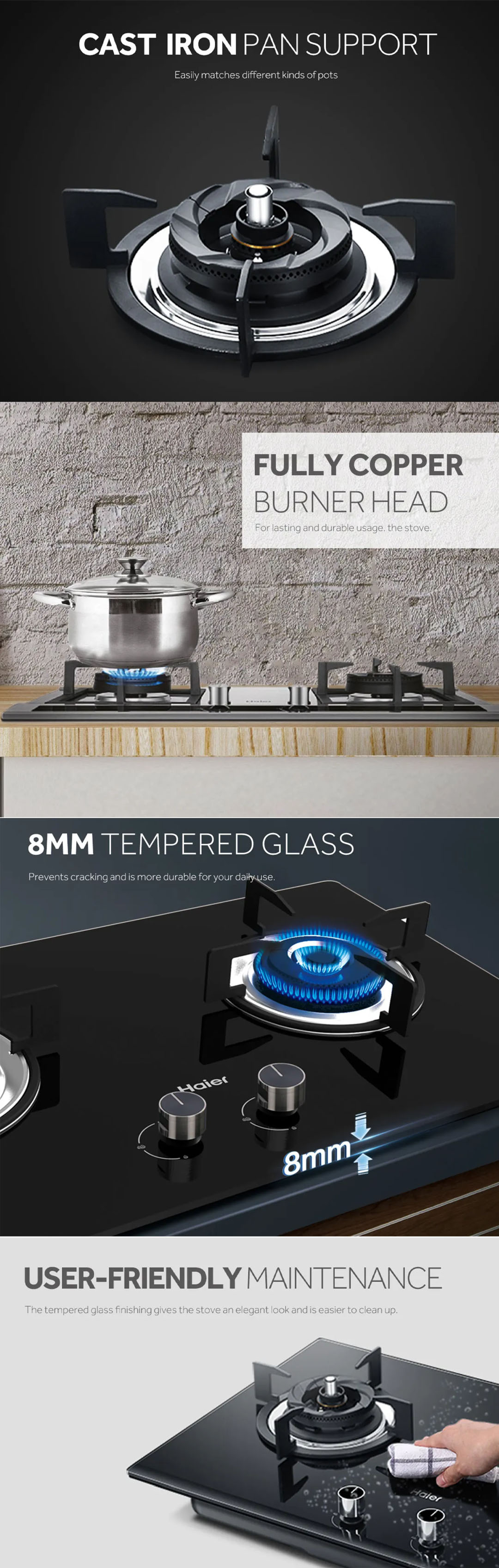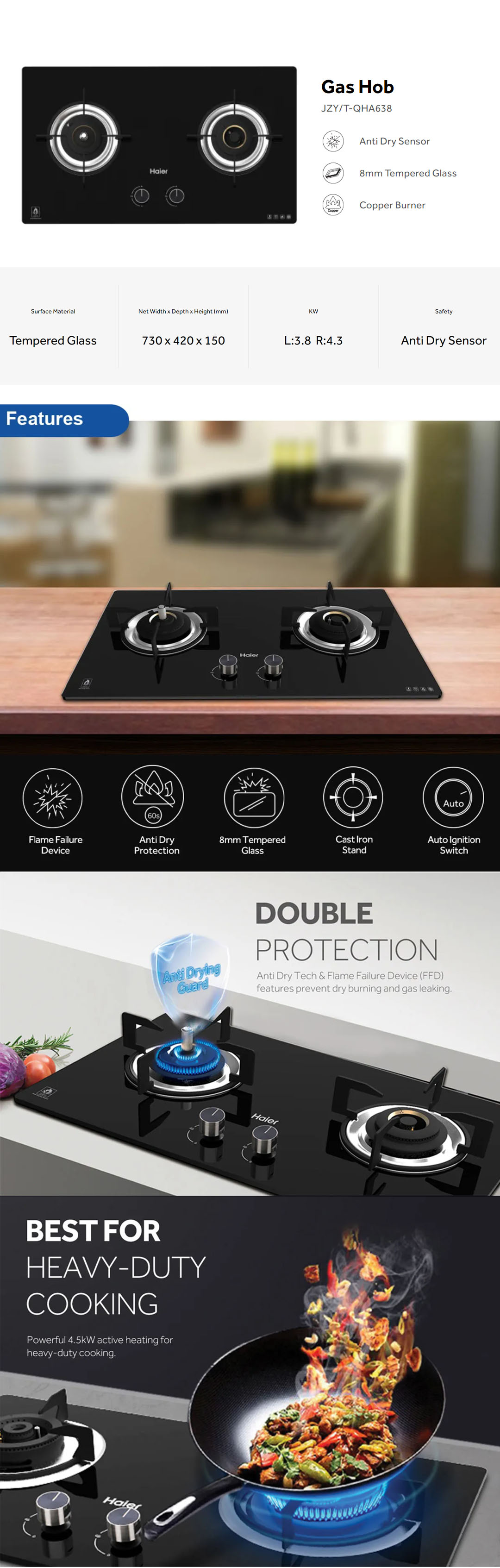 HAIER 2 Burners Built-In Gas Hob JZY/T-QHA638 | Anti Dry Sensor | 8mm Tempered Glass | Copper Burner | Auto Ignition Switch | Gas Hob with 2 Year Warranty