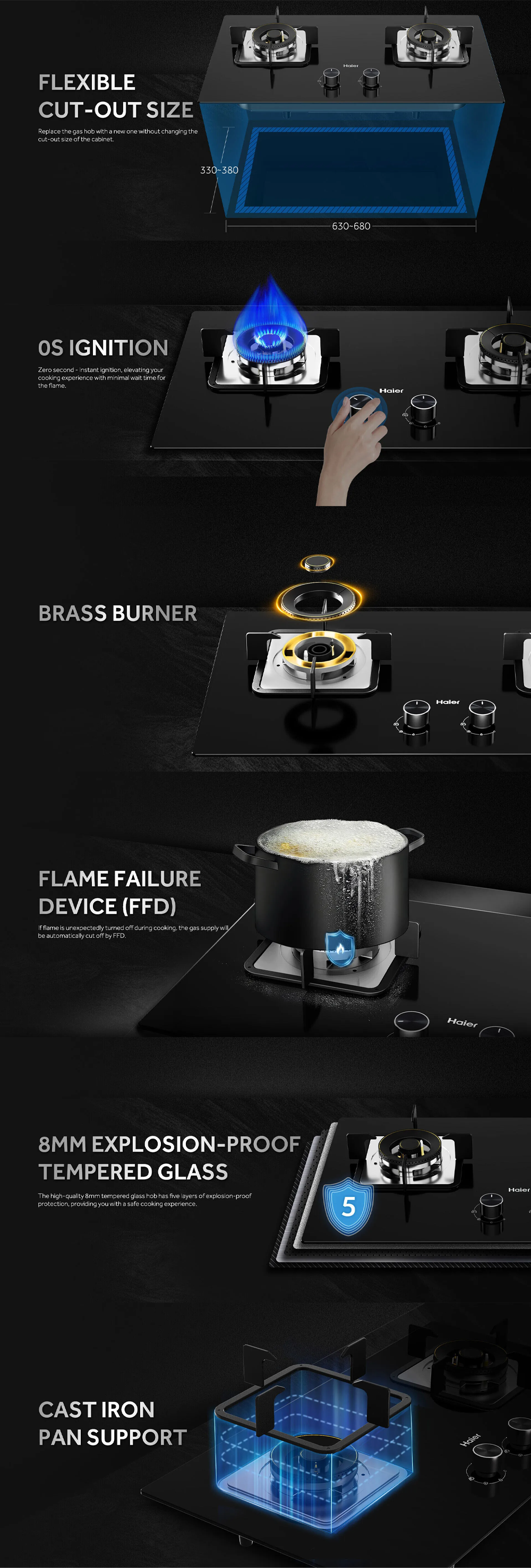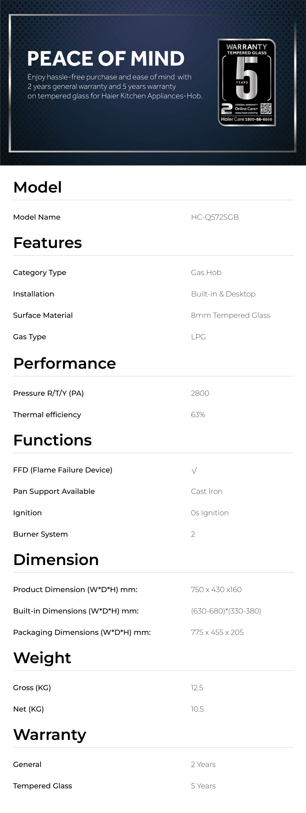 HAIER 2 Burners Built-In Tempered Glass Gas Hob HC-Q572SGB | 5.0kW Power | Flexible Cut Out Size