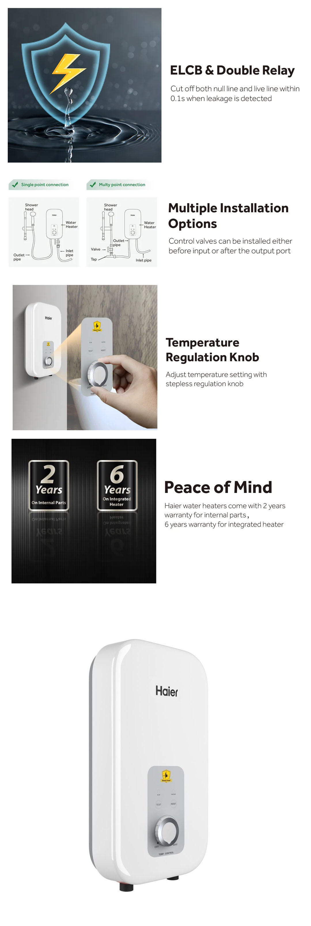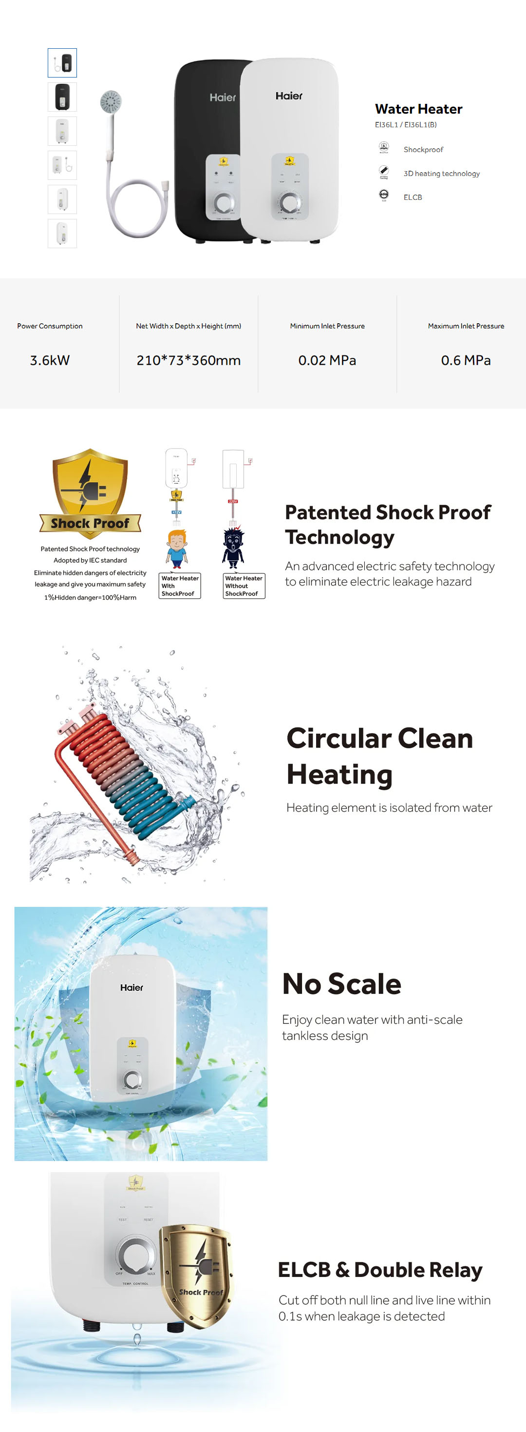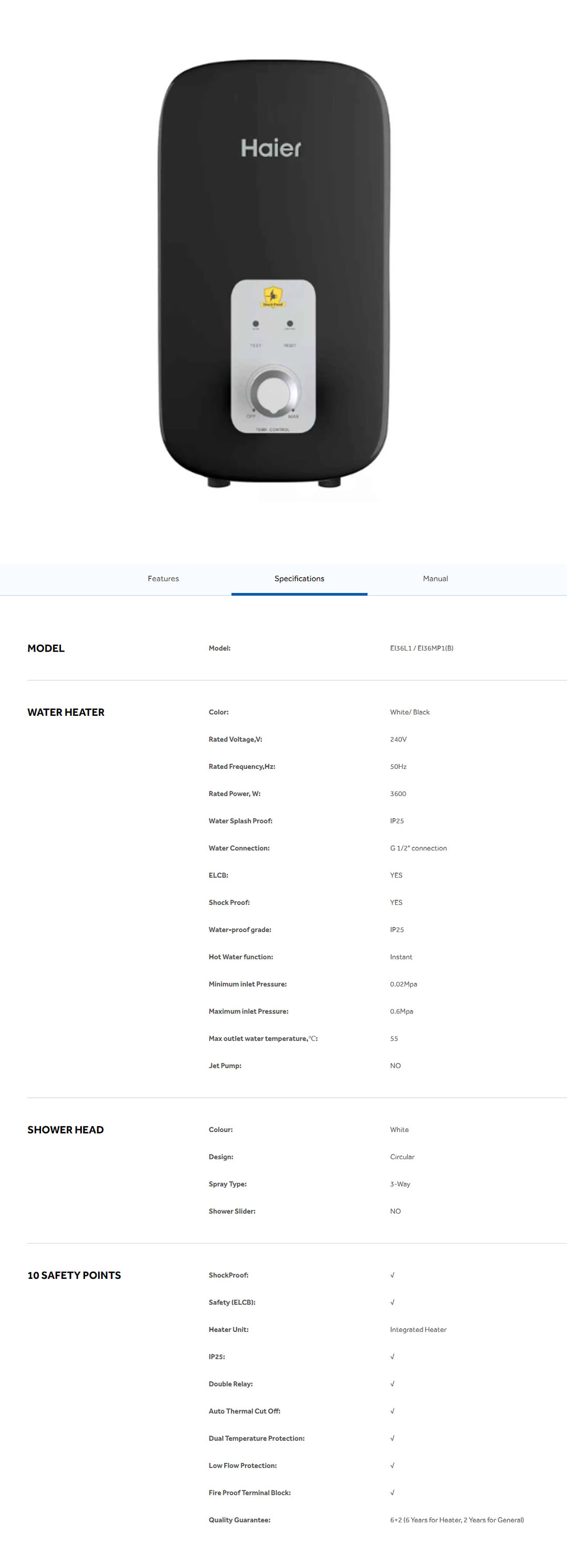 HAIER 3600W Non Pump Water Heater EI36L1(B)/EI36L1 | 3D Heating Technology | Dual Temperature Protection | Shockproof | Water Heater with 2 Year Warranty