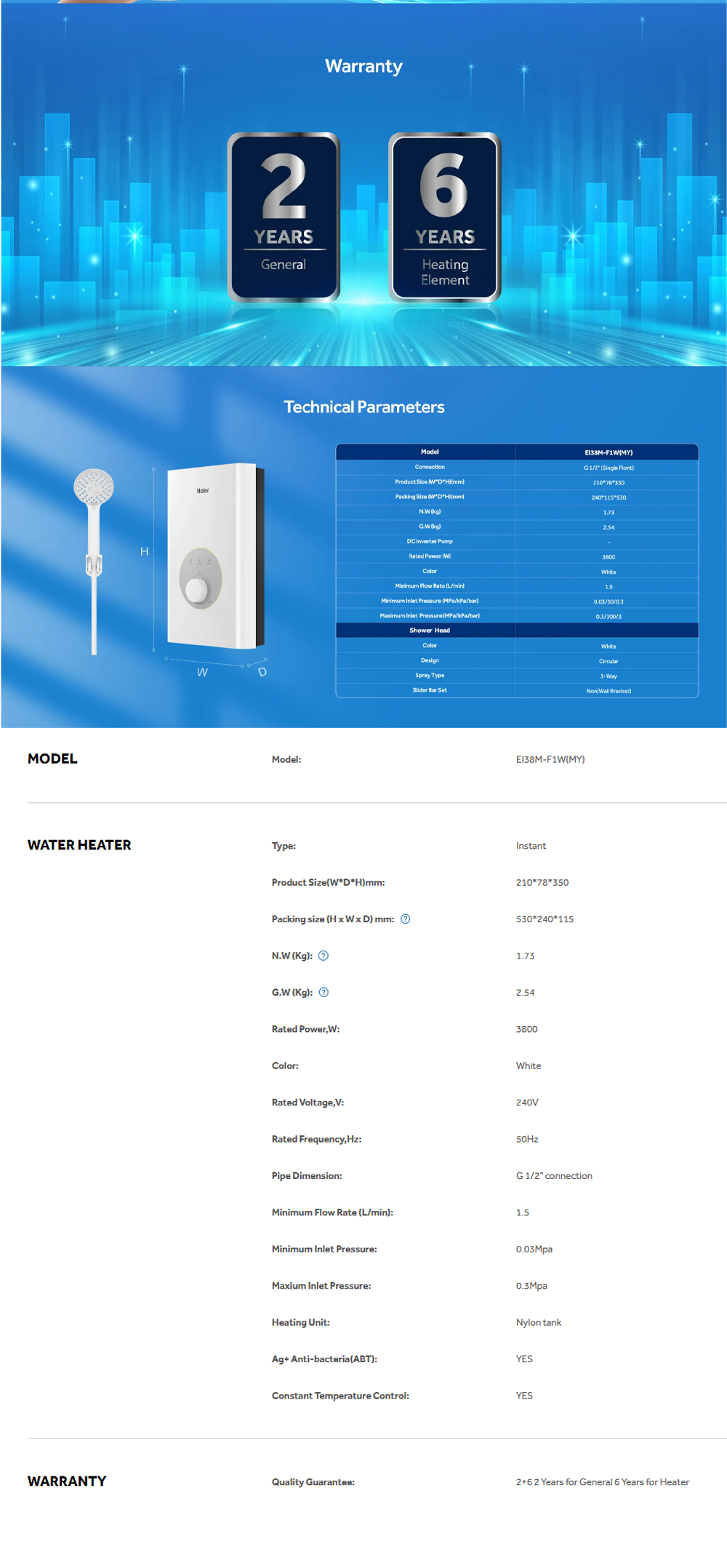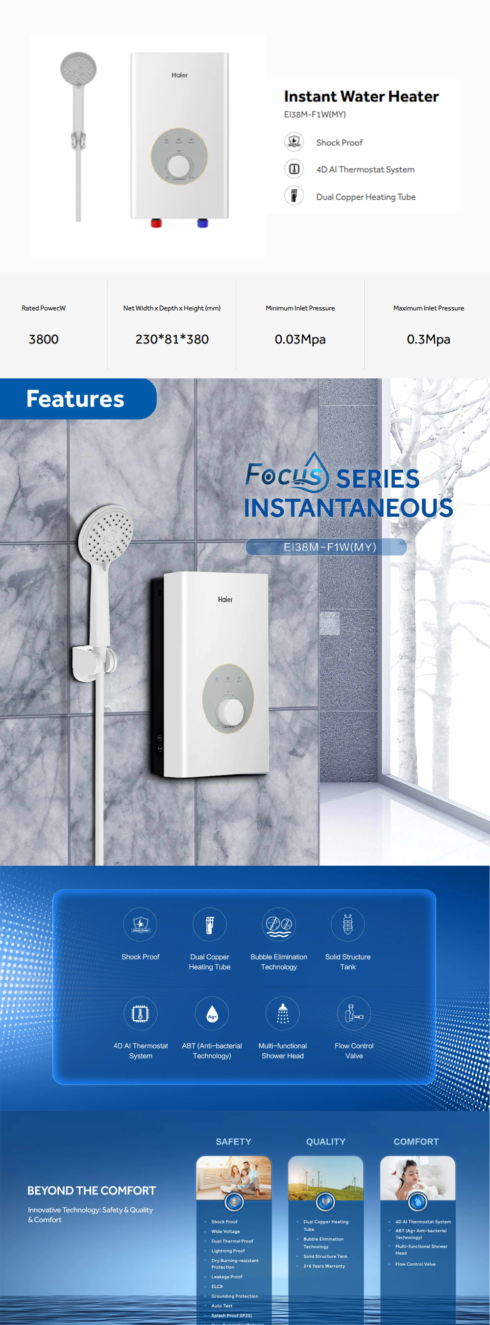 HAIER 3800W Instant Water Heater EI38M-F1W(MY) | Dual Copper Heating Tube | Shock Proof | 4D AI Thermostat System
