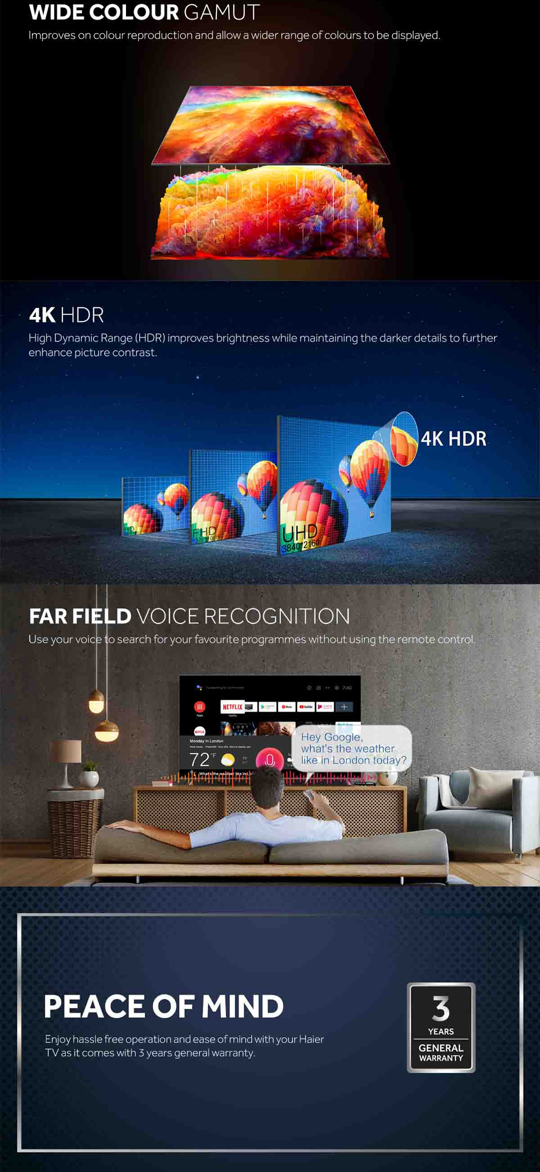 HAIER 55"/65" 4K UHD Android HQLED TV H55S6UG PRO/H65S6UG PRO | Front Built-In Speaker | HQLED | Wide Color Gamut | Android 11 | Chromecast | Google Assistant | HDMI | USB | Android TV with 3 Year Warranty