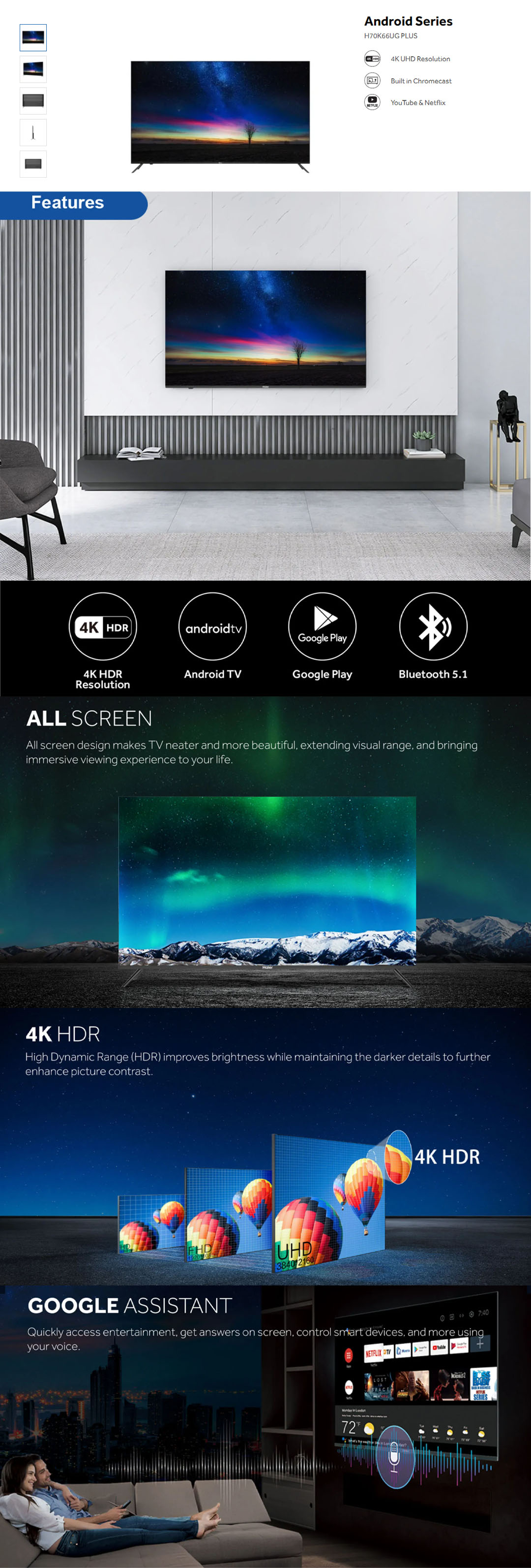 HAIER 70" 4K UHD Android LED TV H70K66UG PLUS | 4K UHD Resolution | Bluetooth 5.1 | Android TV | Built in Chromecast | Smart TV with 2 Years Warranty