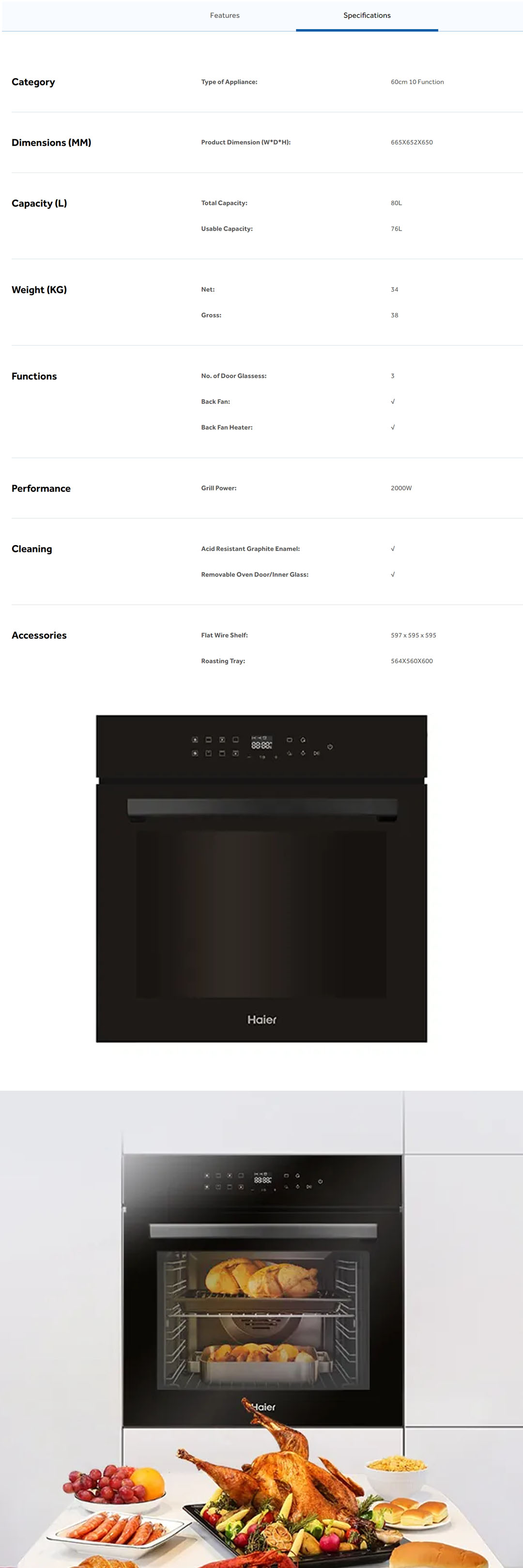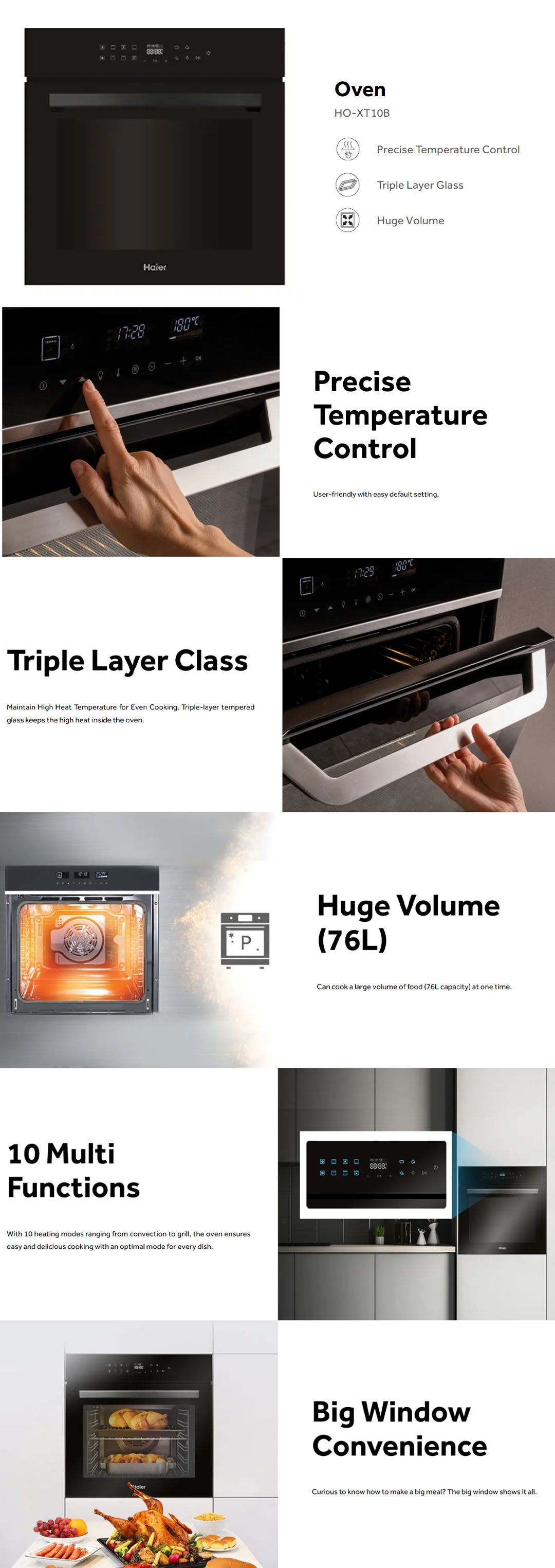 HAIER 76L Built-In Oven Black HO-XT10B | Precise Temperature Control | Triple Layer Glass | Huge Volume | Oven with 2 Year Warranty