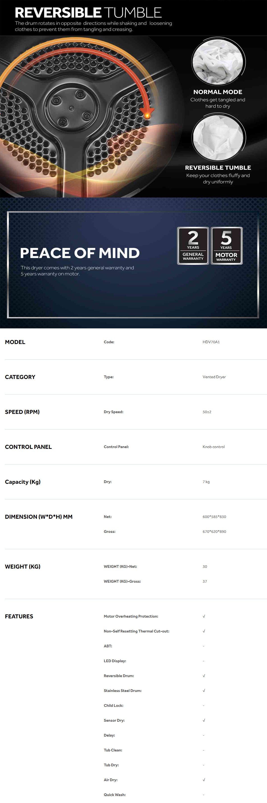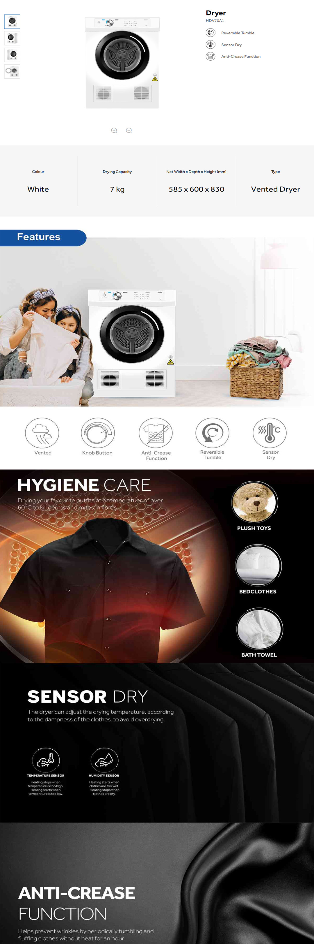 HAIER 7KG Vented Dryer HDV70A1 | Hygiene Care | Sensor Dry | Anti-Crease Function | Reversible Tumble | Knob Control | Air Dry | Reversible Drum | Dryer with 2 Year Warranty