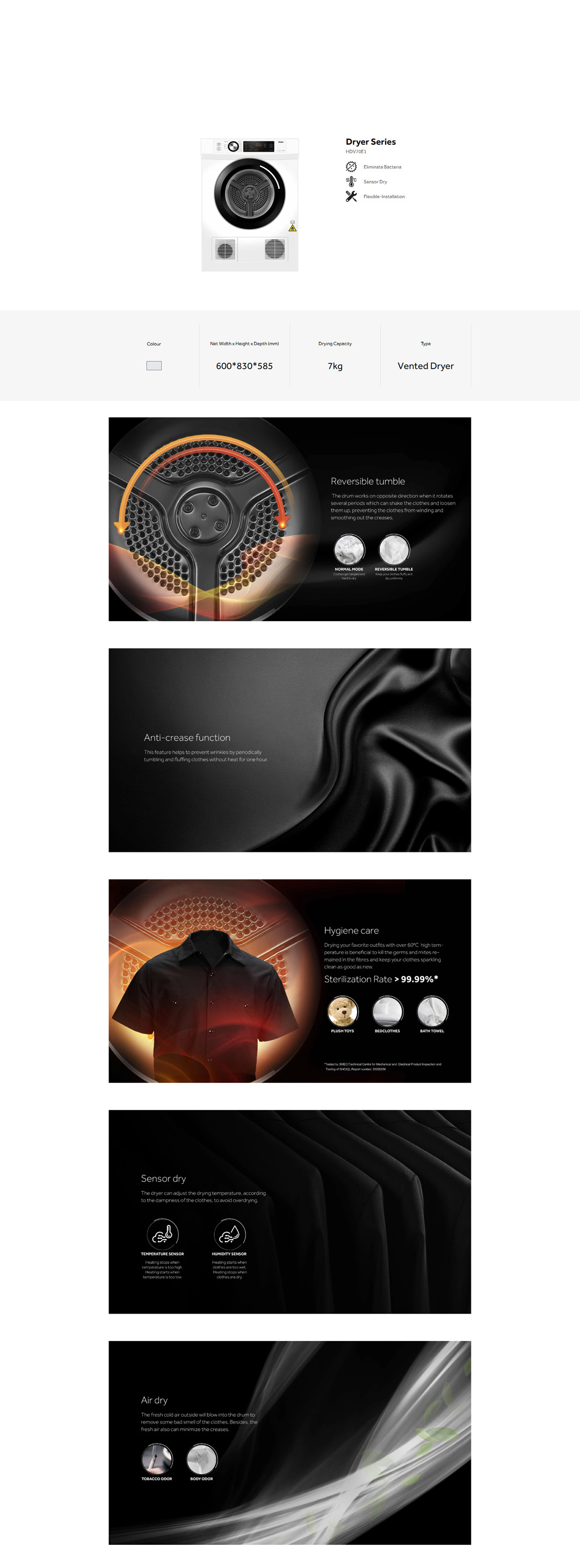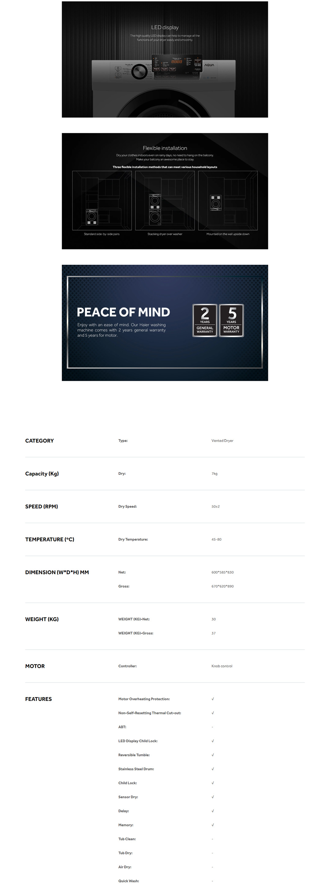 HAIER 7KG Vented Dryer HDV70E1 | Eliminate Bacteria | Sensor Dry | Knob control | Child Lock | Dryer with 2 Year Warranty