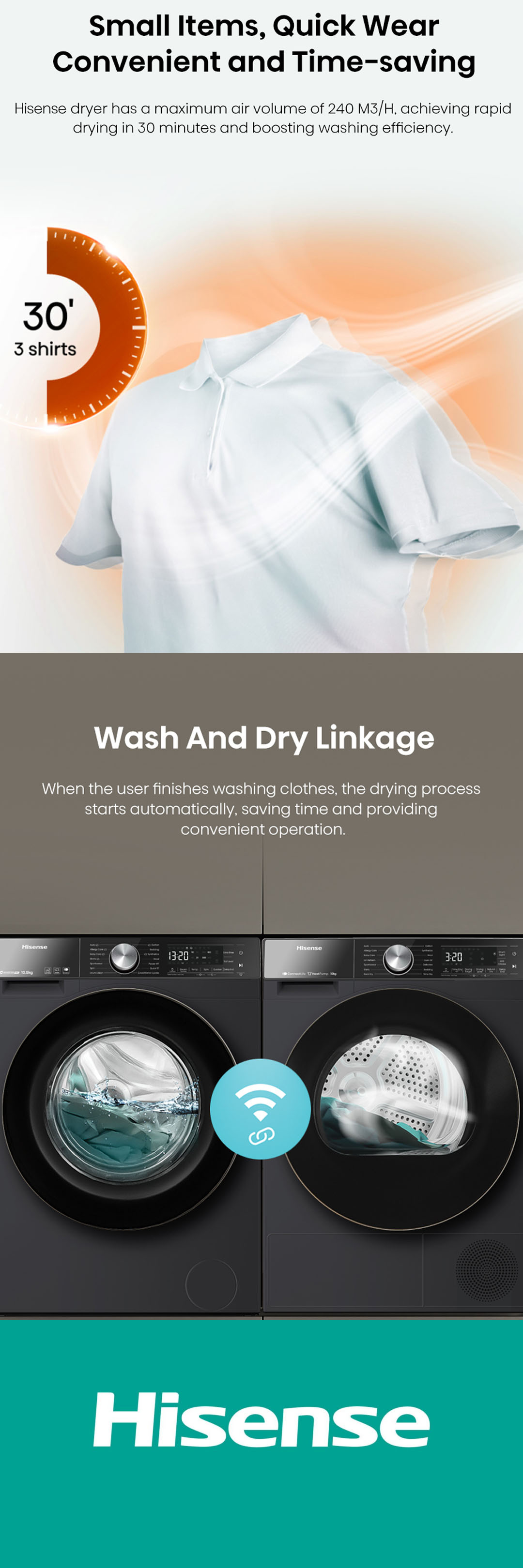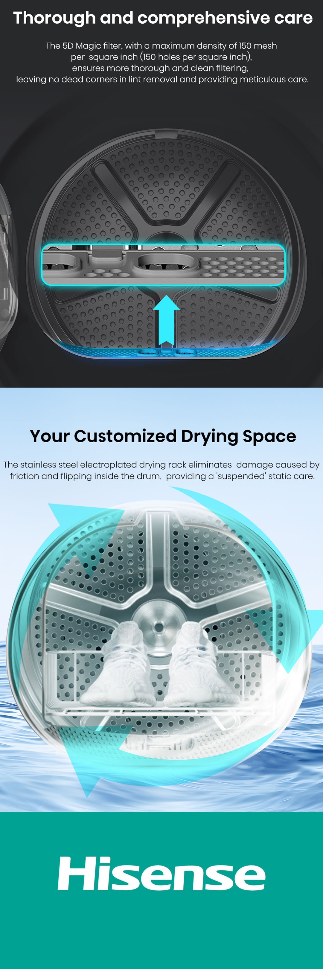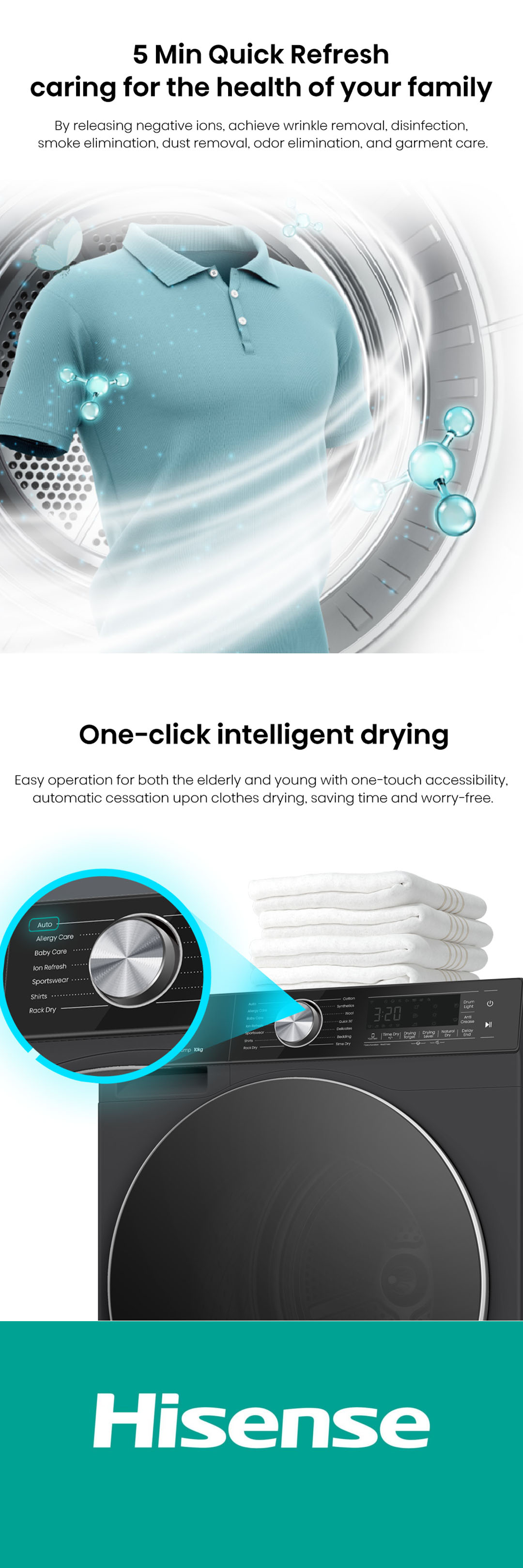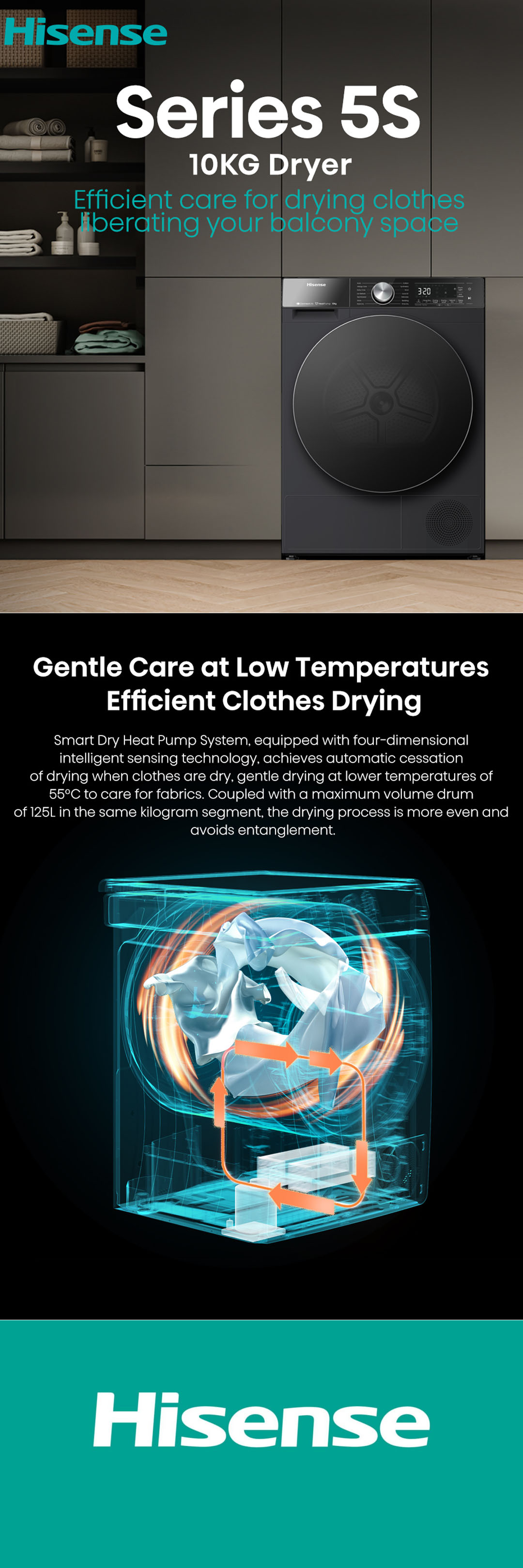 HISENSE 10KG Heat Pump Dryer DH5S1095UB | Buzzer Electronic Control | Button Program Selection | Heat Pump Drying | Transparent Door | Dryer with 2 Years Warranty