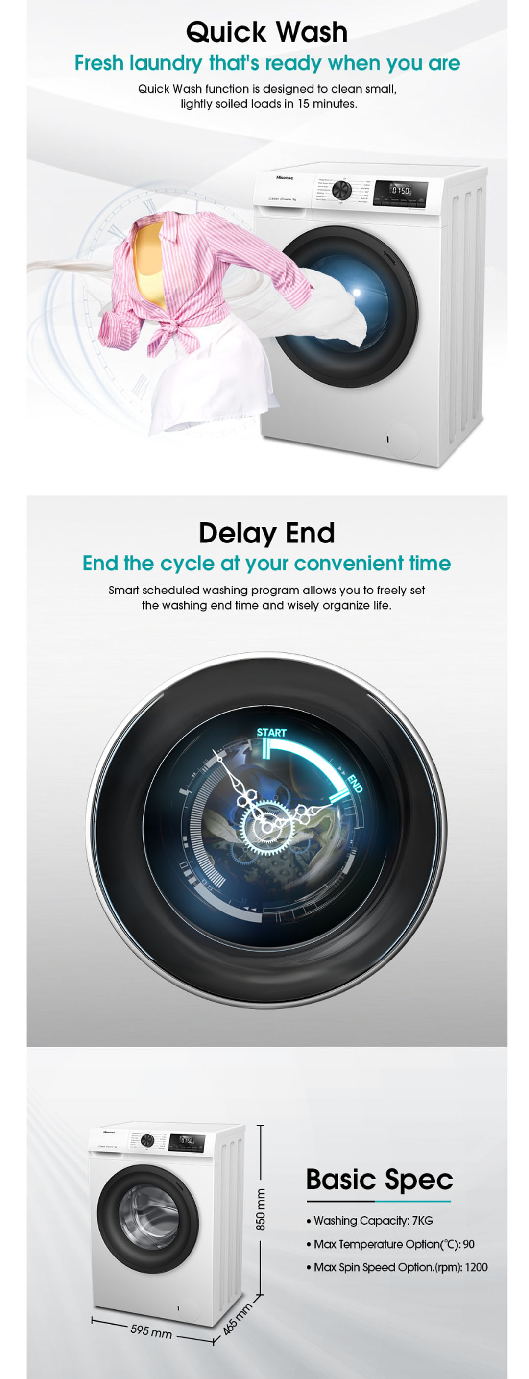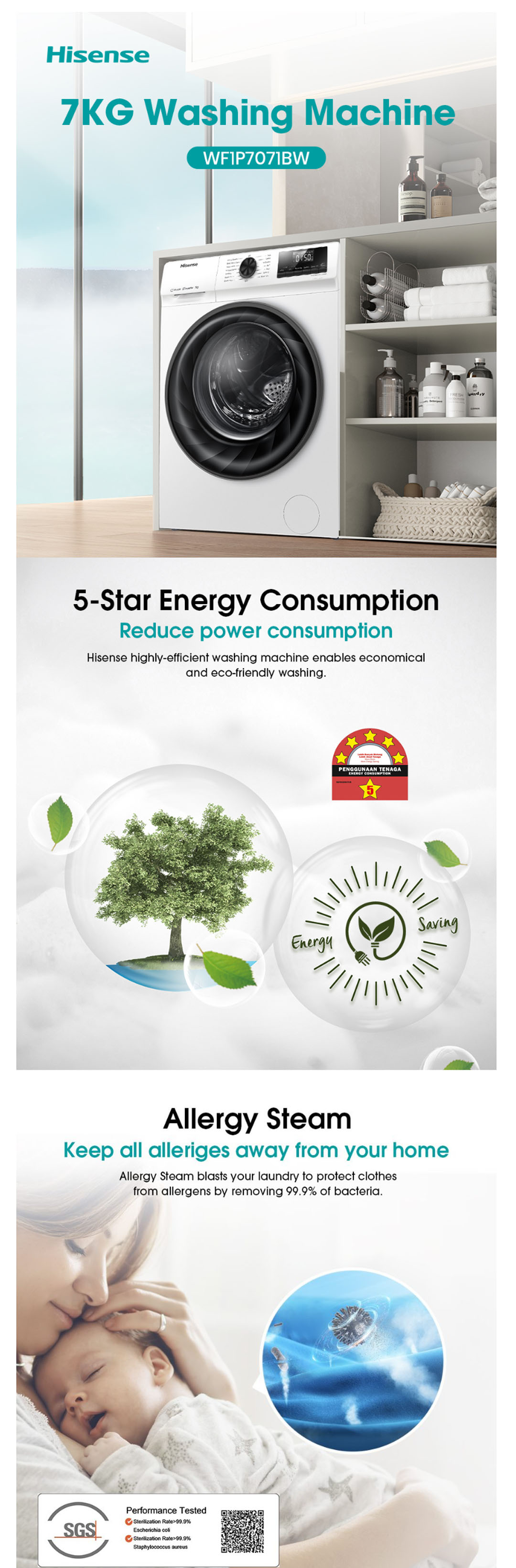 HISENSE 7KG Front Load Inverter Washing Machine WF1P7071BW | Durable Inverter | Allergy Steam | 5-Star Energy Consumption | Drum Clean | Washing Machine with 2 Years Warranty