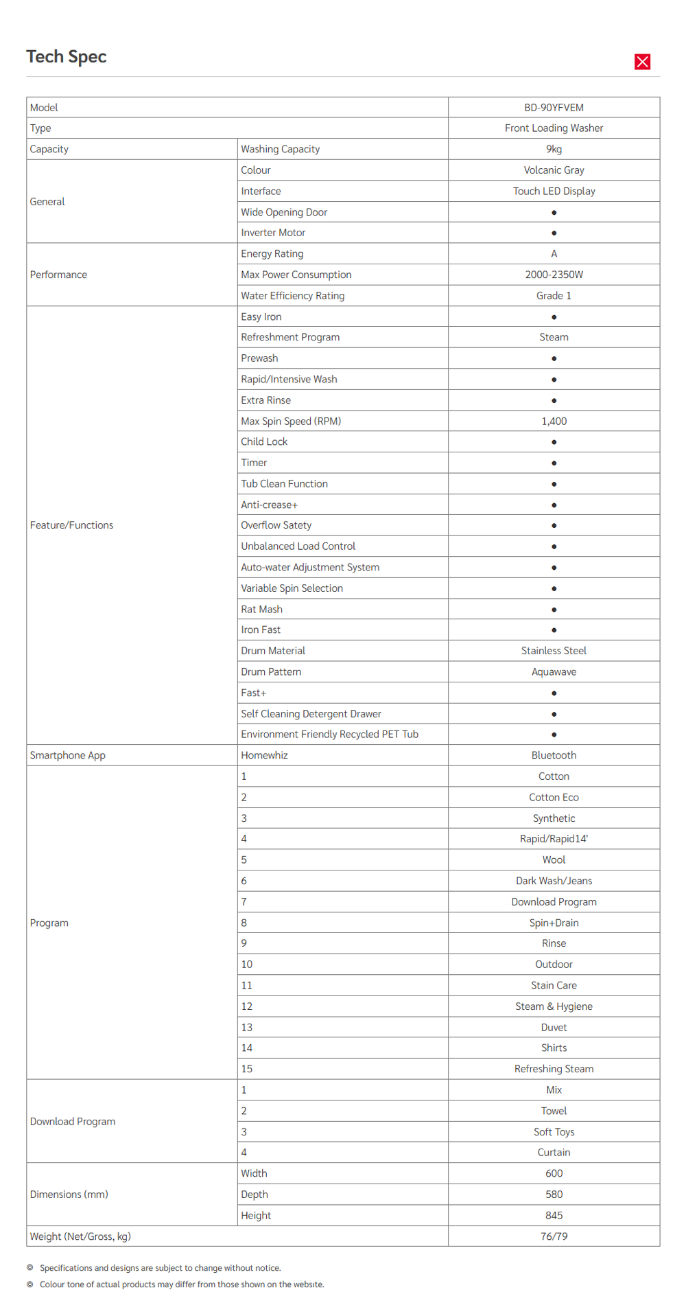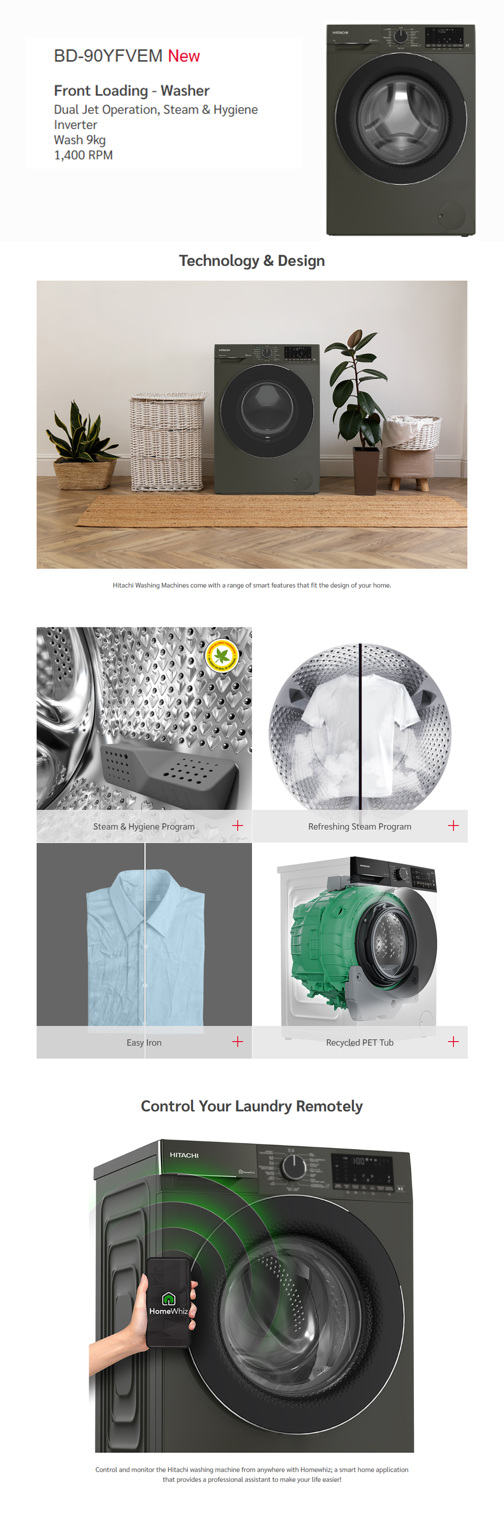 Hitachi 9/ 10KG Front Load Inverter Steam & Hygiene Washing Machine BD-90YFVEM / BD-100XFVEADM | Steam & Hygience Programme | Efficient Inverter Motor | 15 Preset Programmes