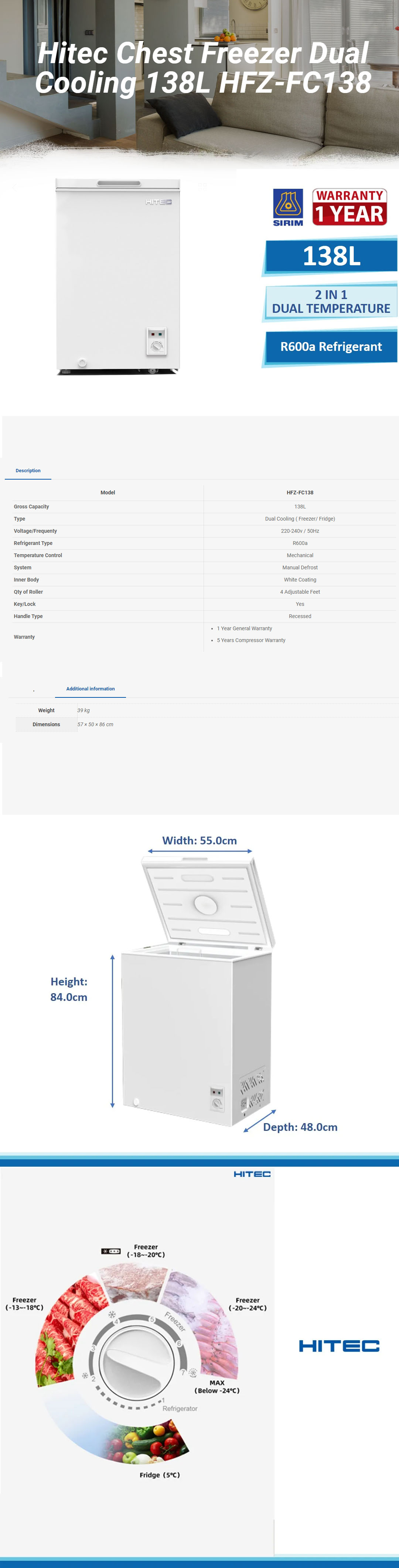 HITEC 138L Dual Cooling Chest Freezer HFZ-FC138 | Removeable Basket | Manual Defrost System | Key Lock | Chest Freezers with 1 Year Warranty