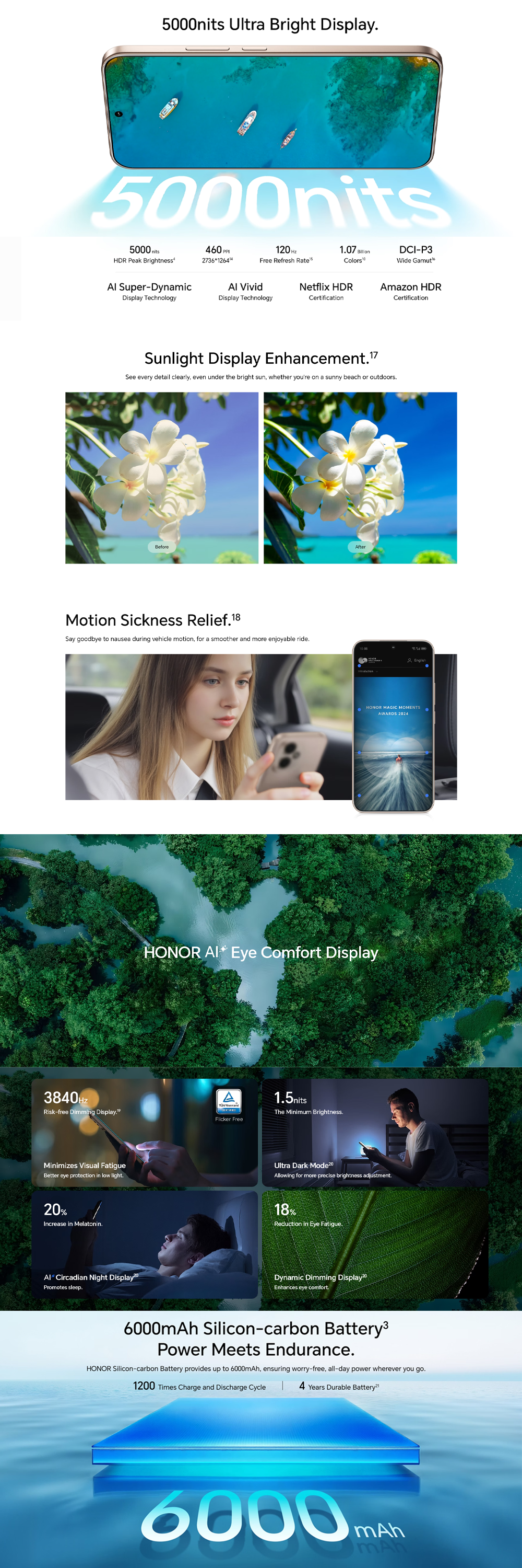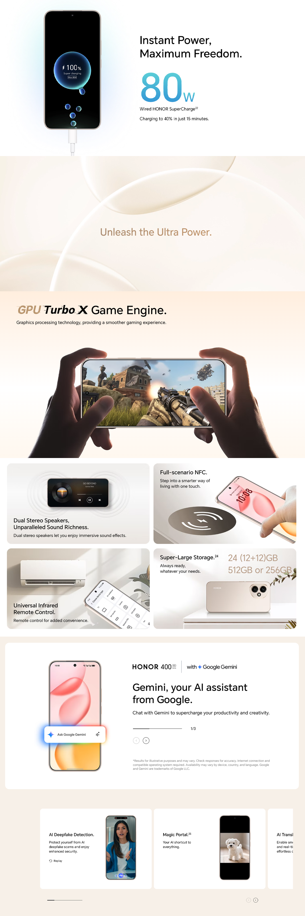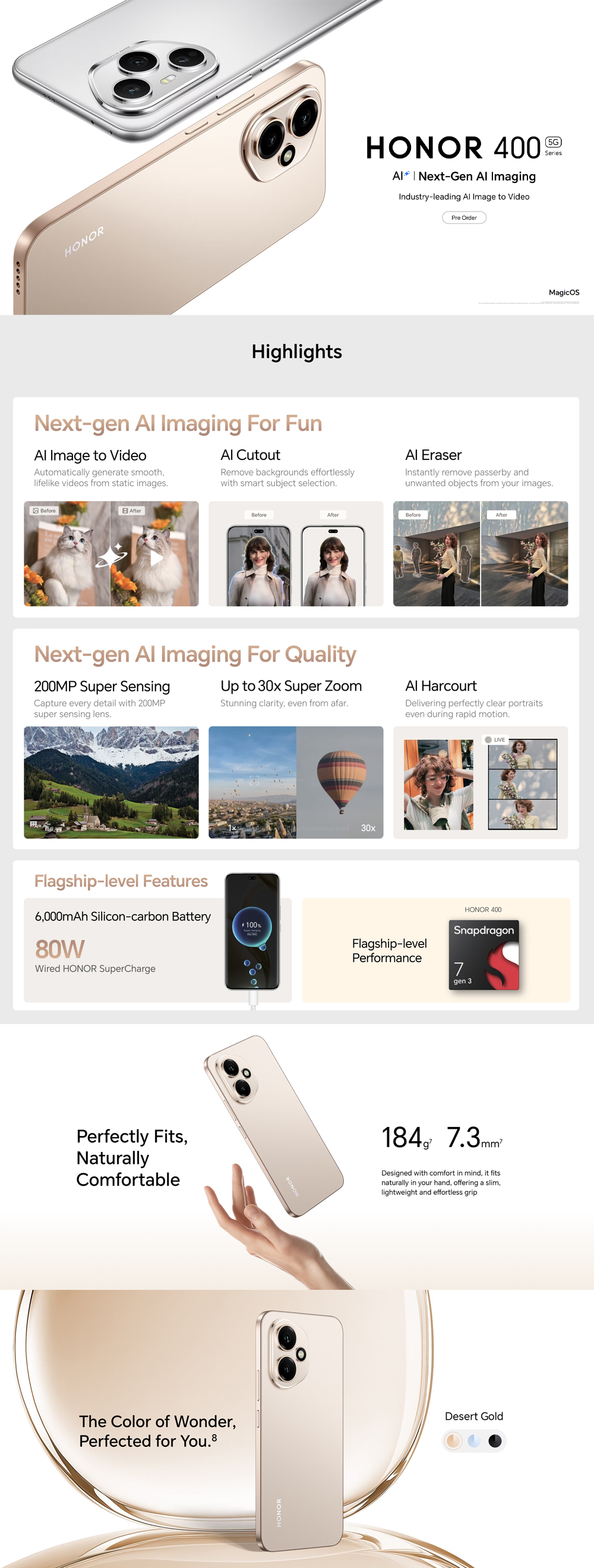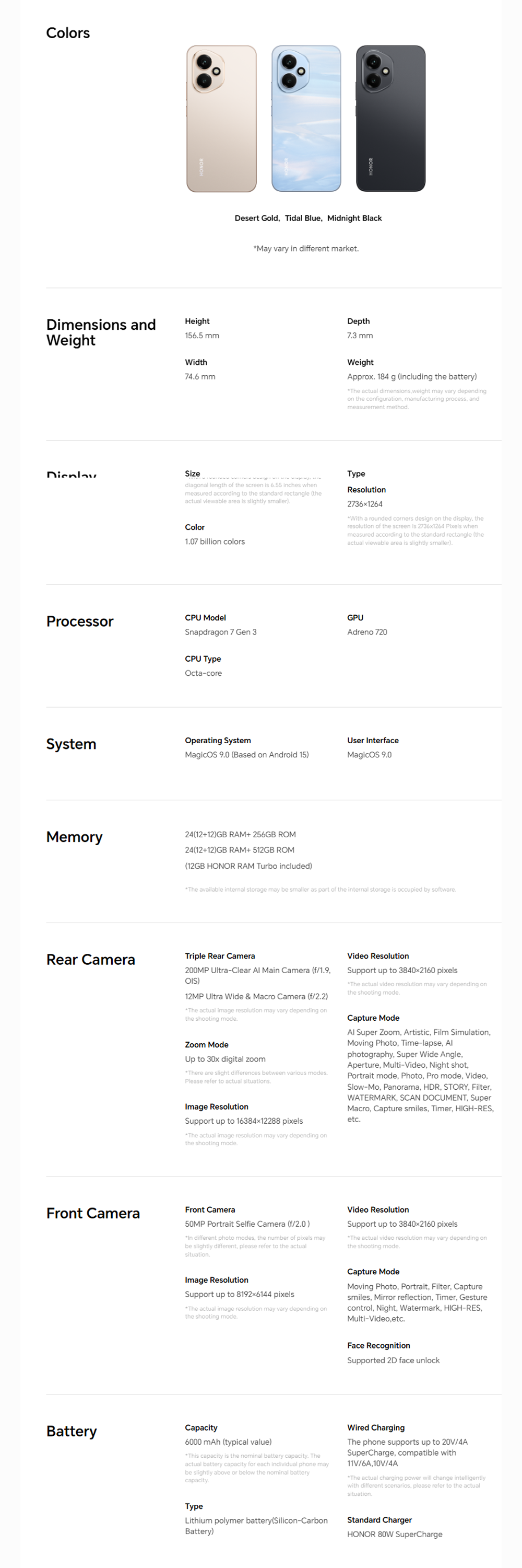 HONOR 400 12GB+256GB/ 12GB+512GB | 200MP Main Camera | 6.55 inch | Qualcomm SM7550-AB Snapdragon 7 Gen 3 (4 nm) | Li-Po 6000 mAh,Fast charging 80W