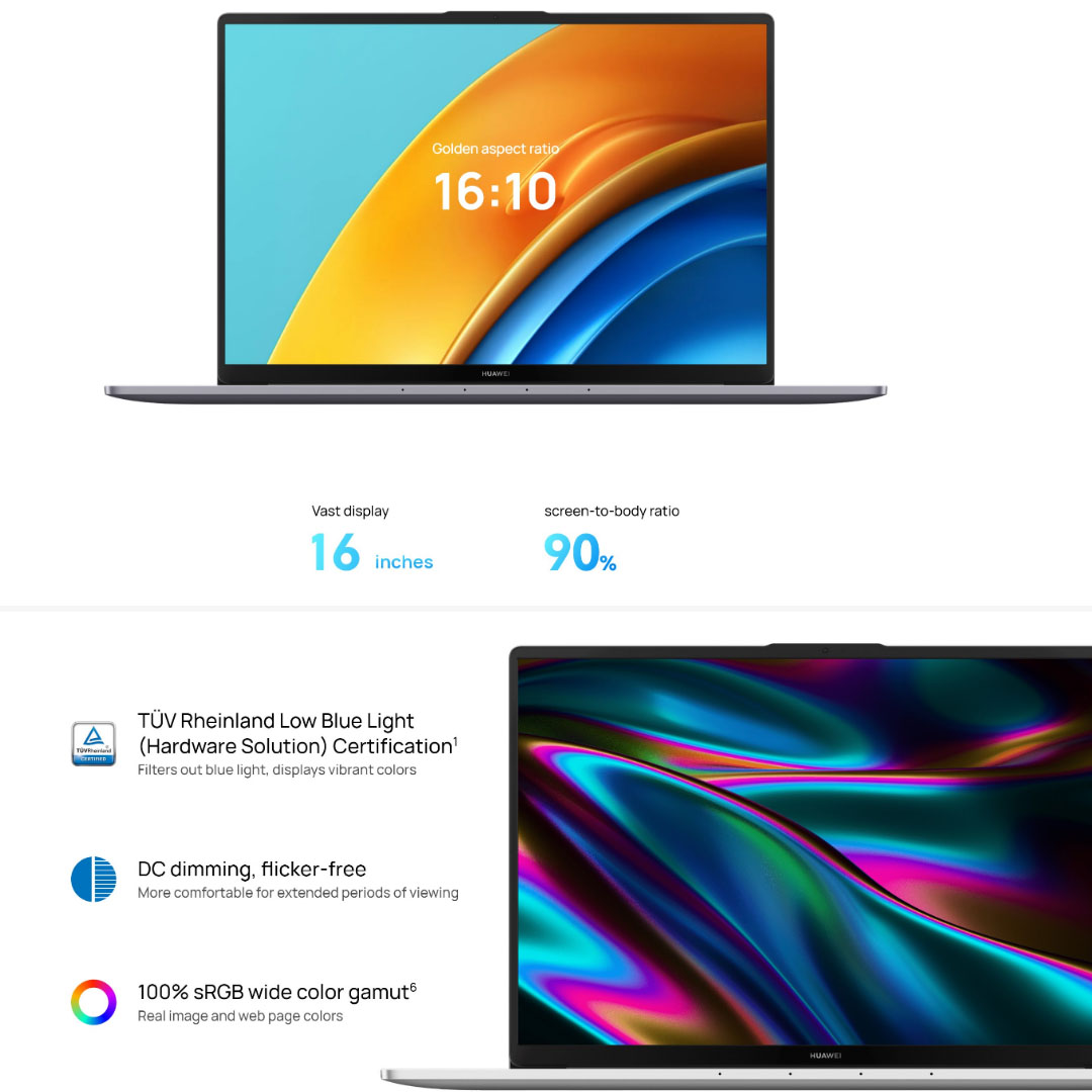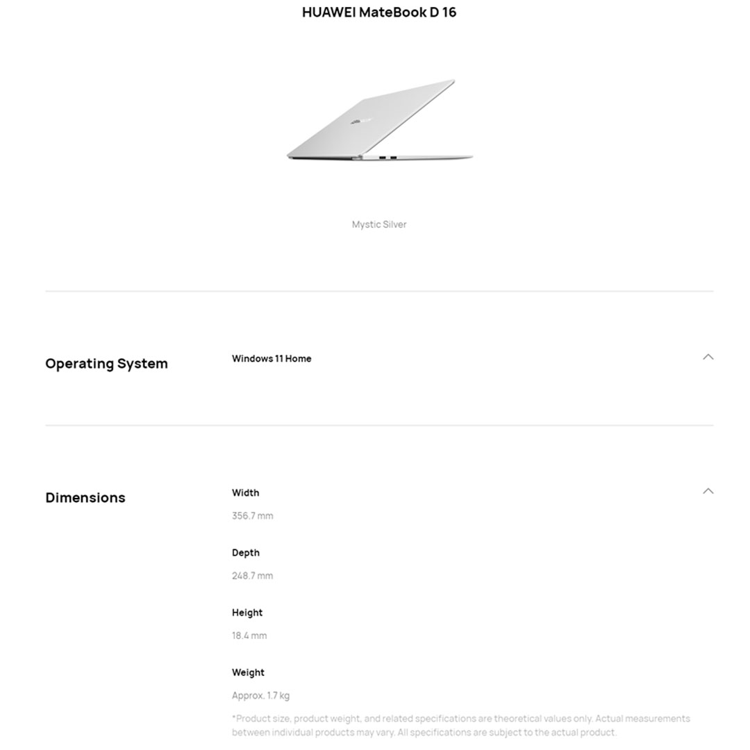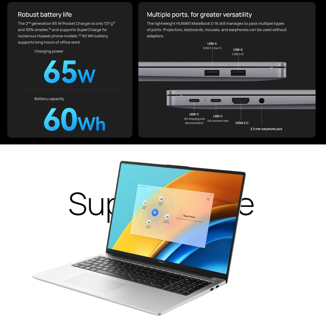 Huawei MateBook D16 Laptop 53013DCG (Intel Core i7-12700H/ 16GB+512GB SSD/ 16-inch FHD/ W11) | Smart Conference | Super Device | Bluetooth 5.1 | Laptop with 1 Year Warranty