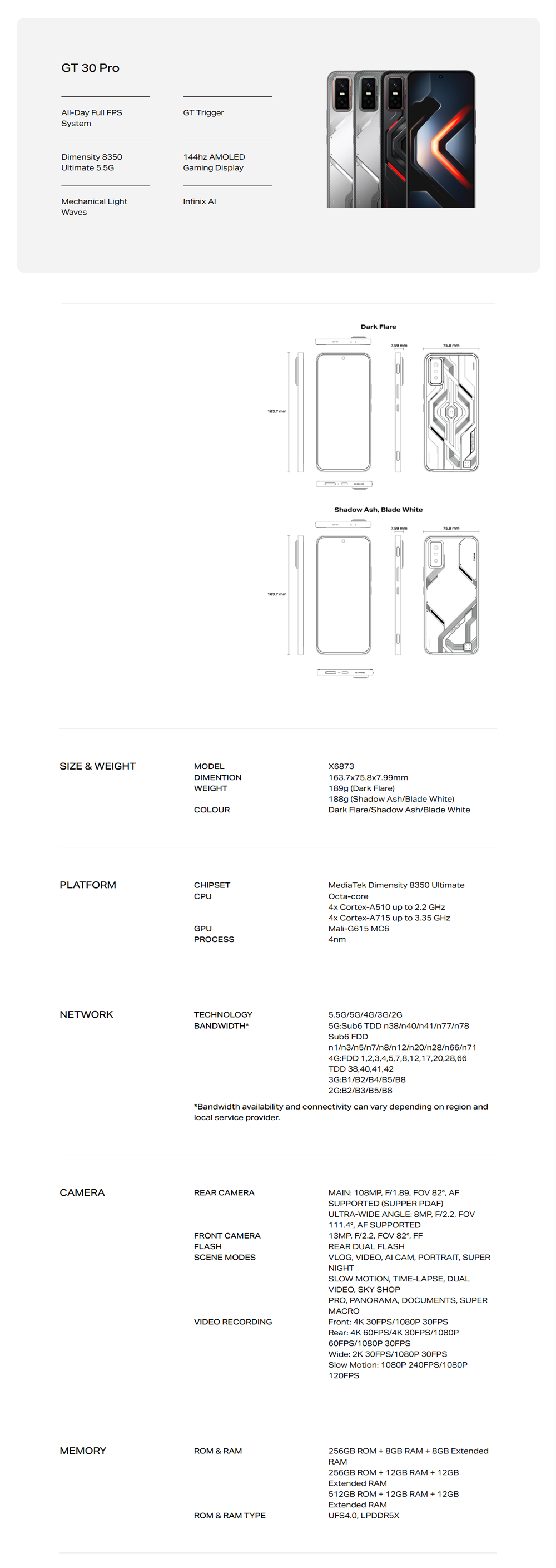 Infinix GT 30 Pro 12GB+256GB/ 12GB+512GB | 6.78 inch AMOLED | MediaTek Dimensity 8350 Ultimate | 108MP Main Camera | Li-Po 5500mAh