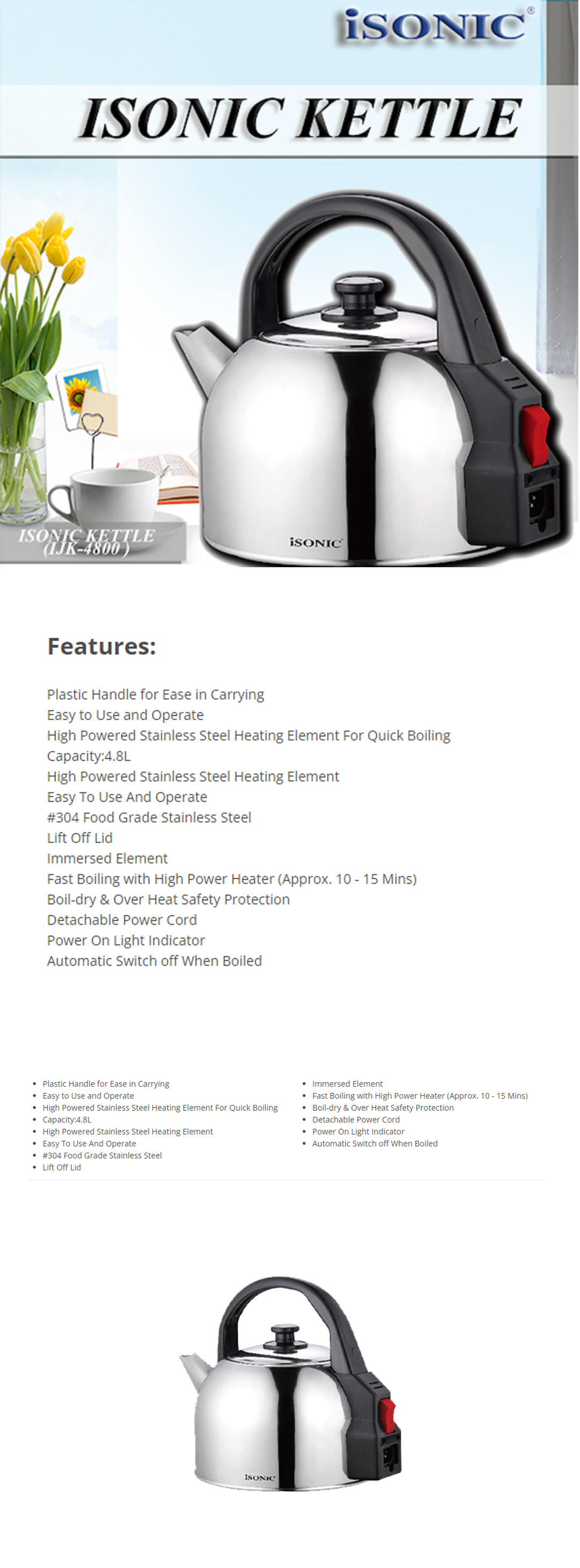 ISONIC 4.8L Stainless Steel Kettle IJK-4800 | Detachable Power Cord | Power On Light Indicator | Lift Off Lid | Kettle with 1 Year Warranty