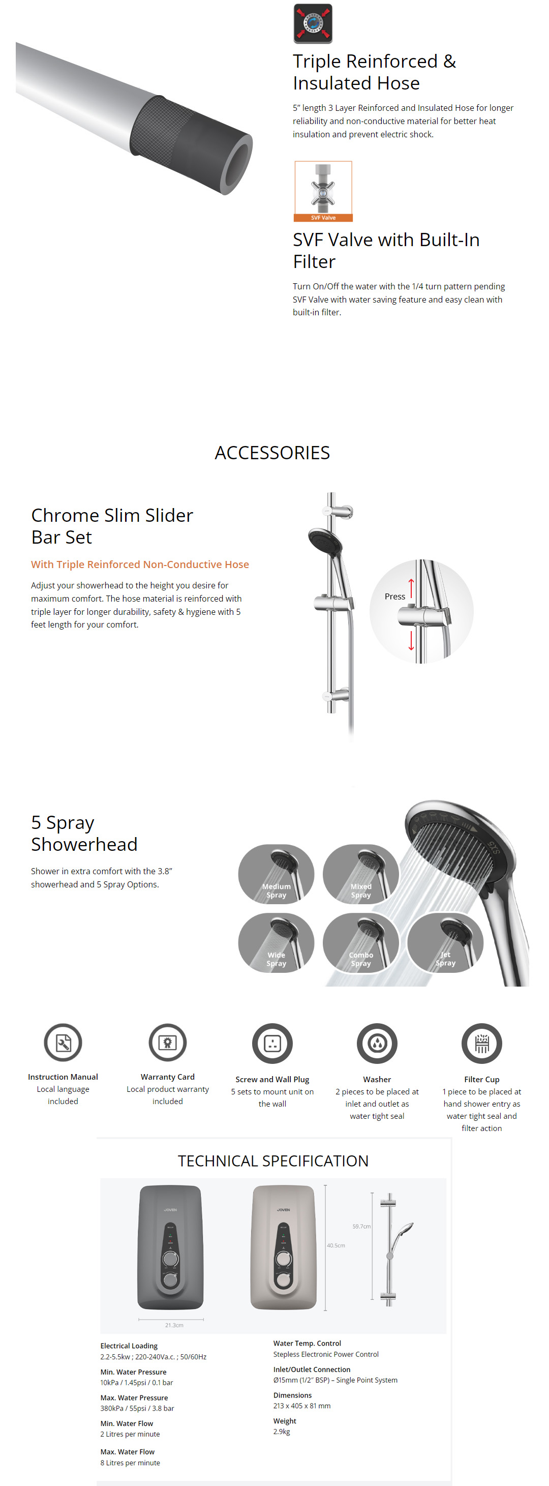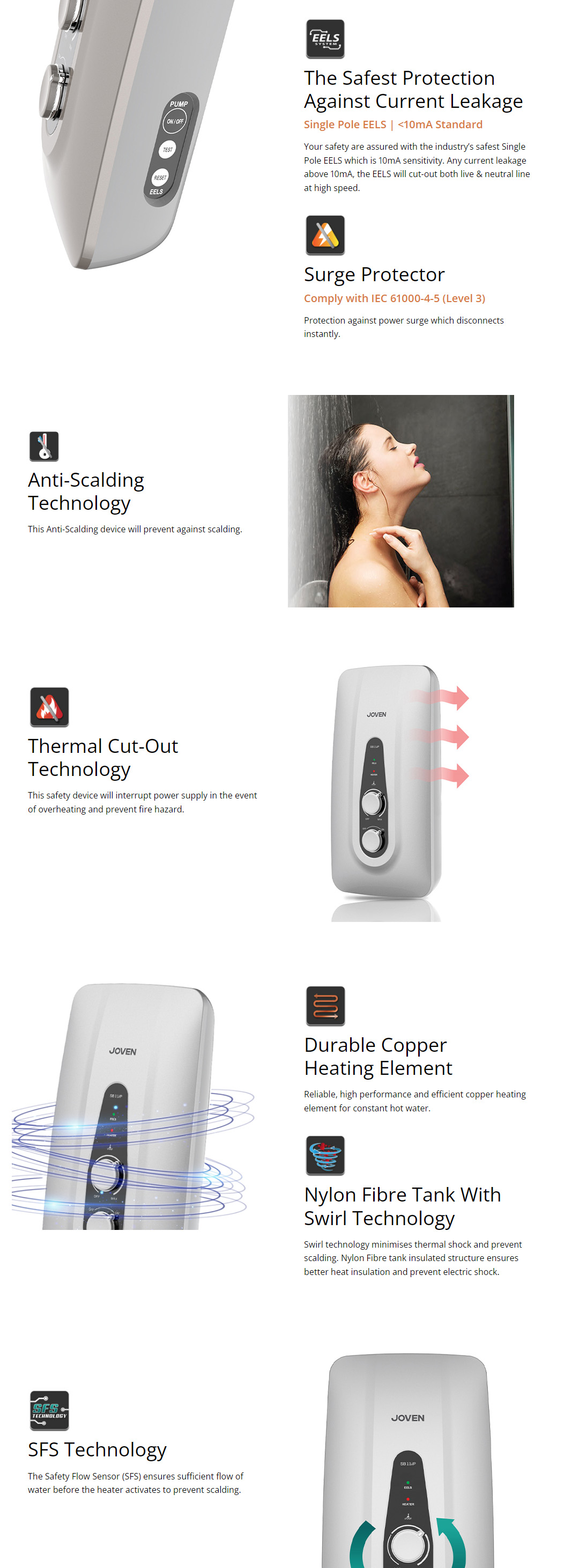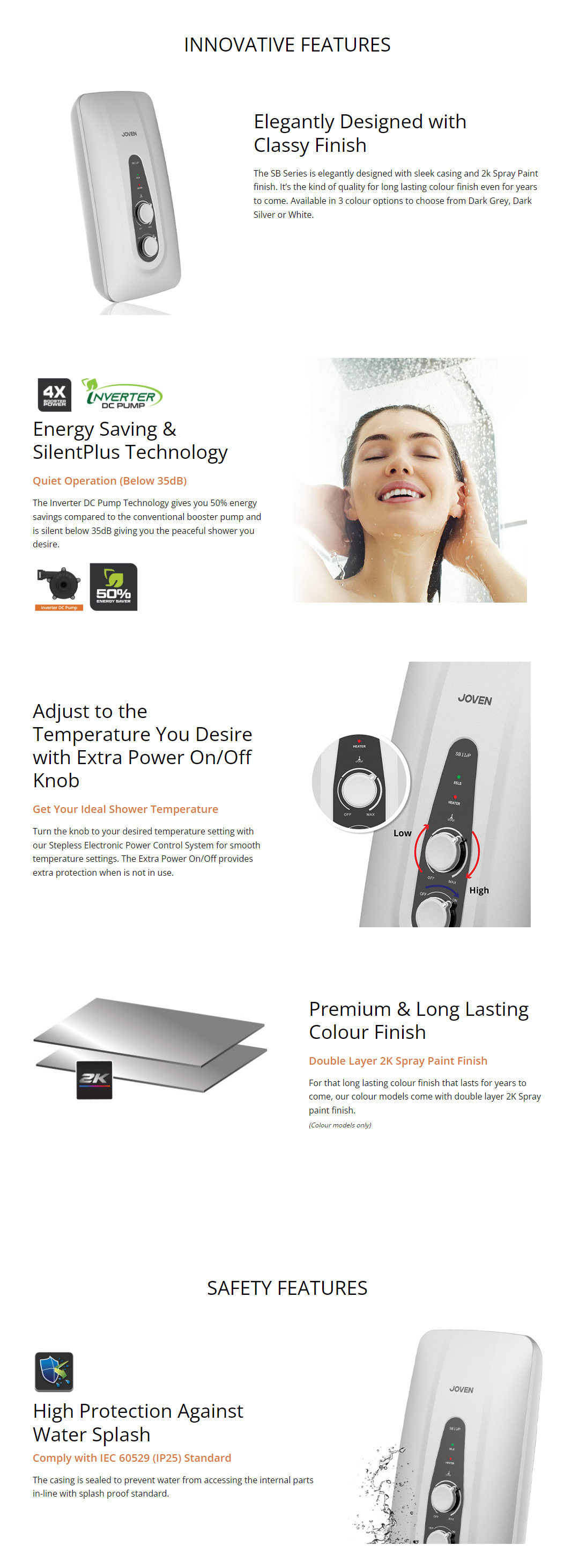 JOVEN 3600W DC Inverter Silent Pump Water Heater SB11iP | 5 Spray Showerhead | SFS Technology | Durable Copper Heating Element | Water Heater with 1 Year Warranty