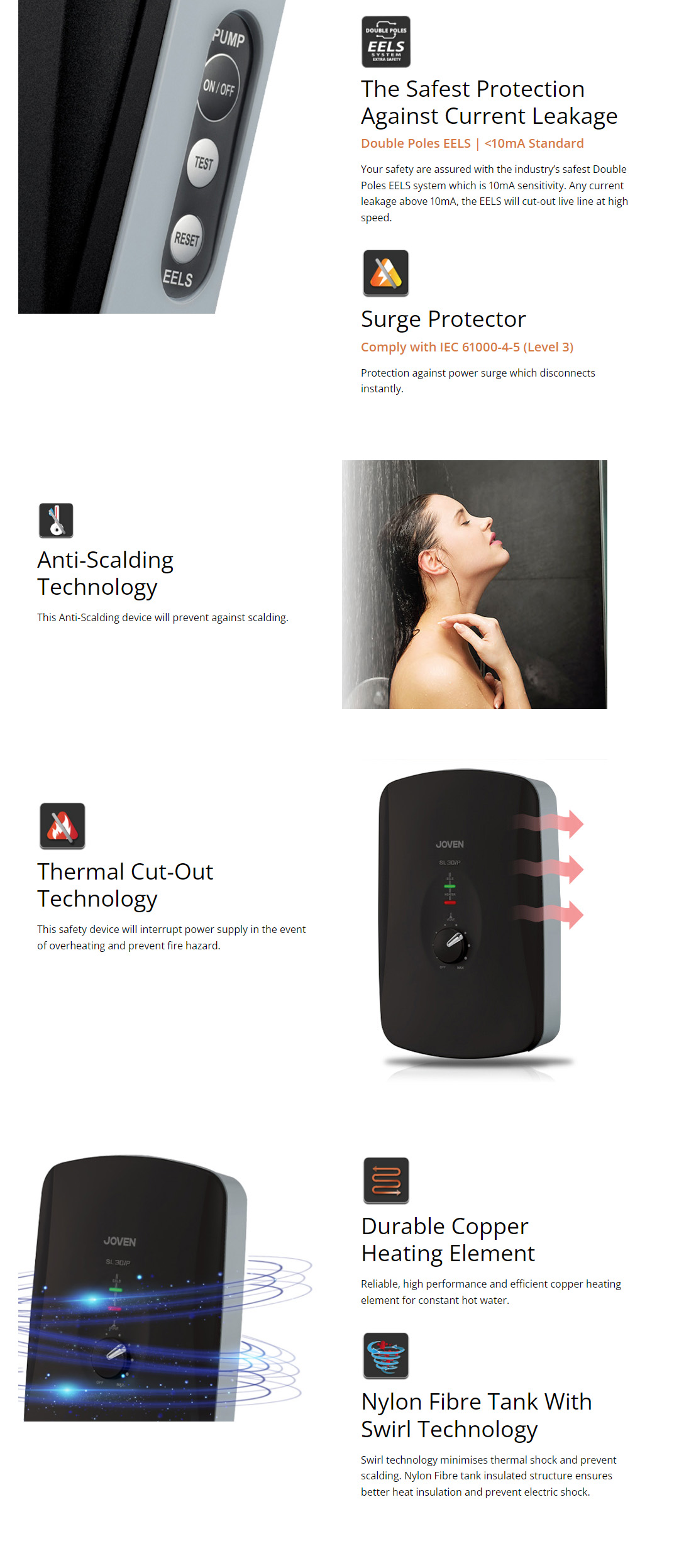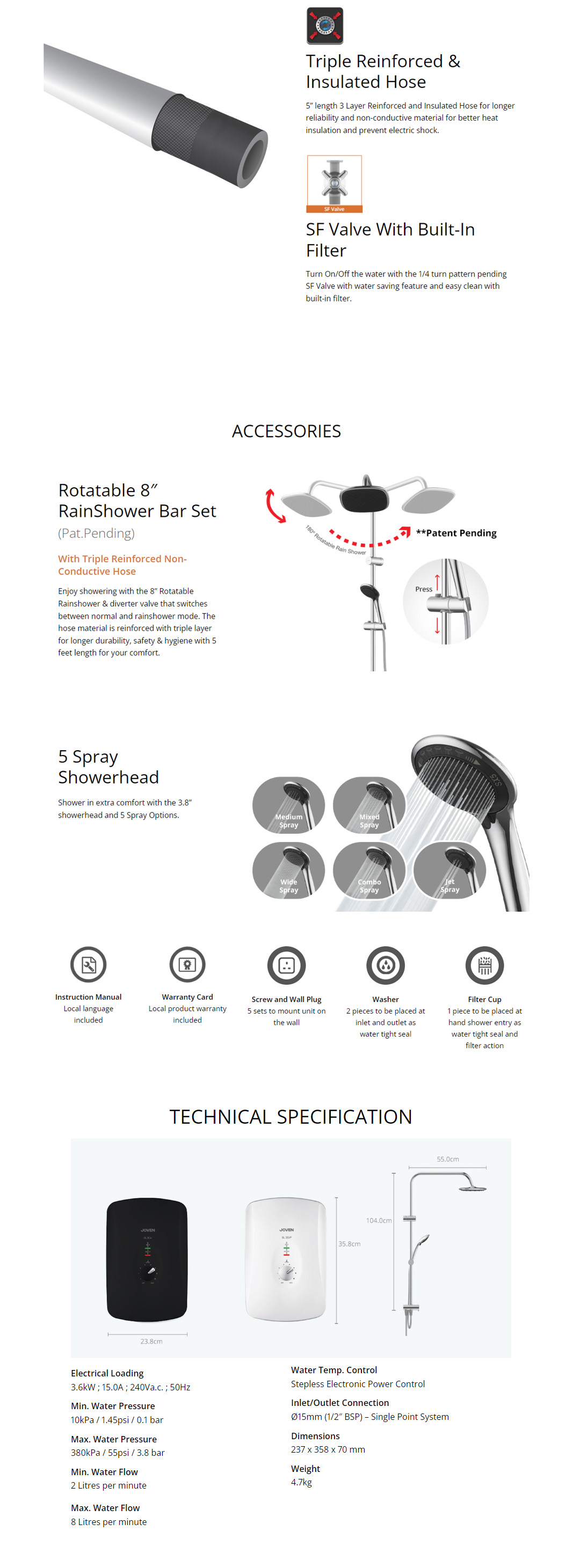 JOVEN 3600W DC Inverter Silent Pump Water Heater with Rain Shower SL30iP-RS | 5 Spray Showerhead | SFS Technology | Durable Copper Heating Element | Water Heater with 1 Year Warranty