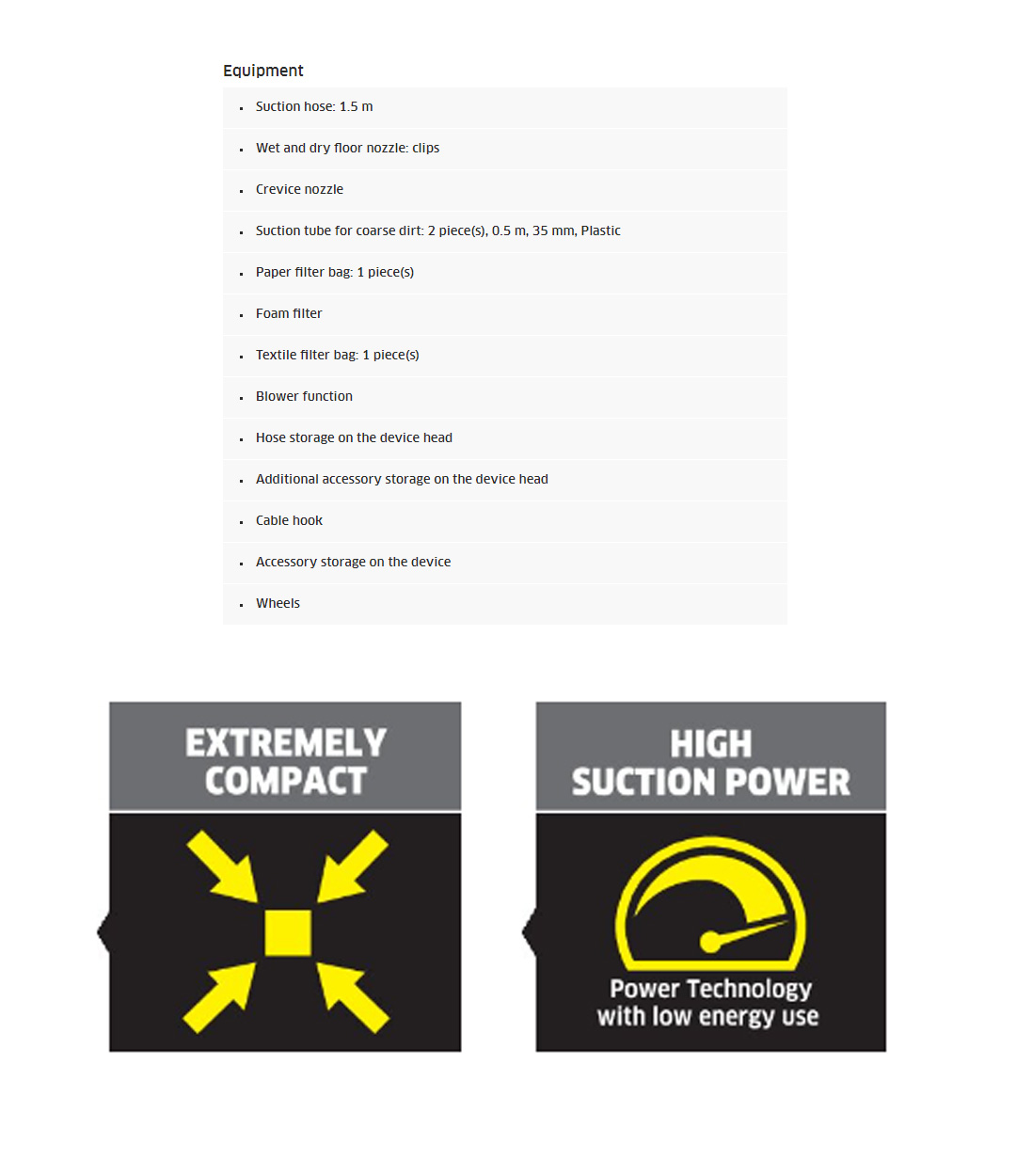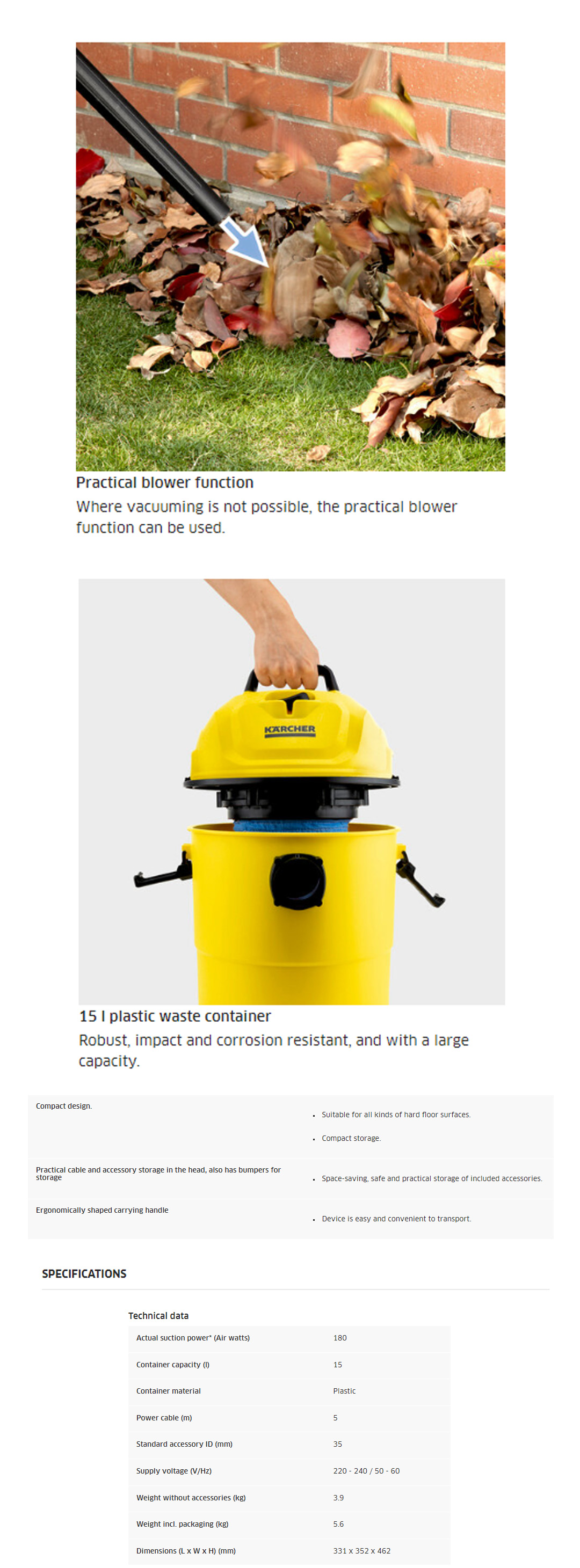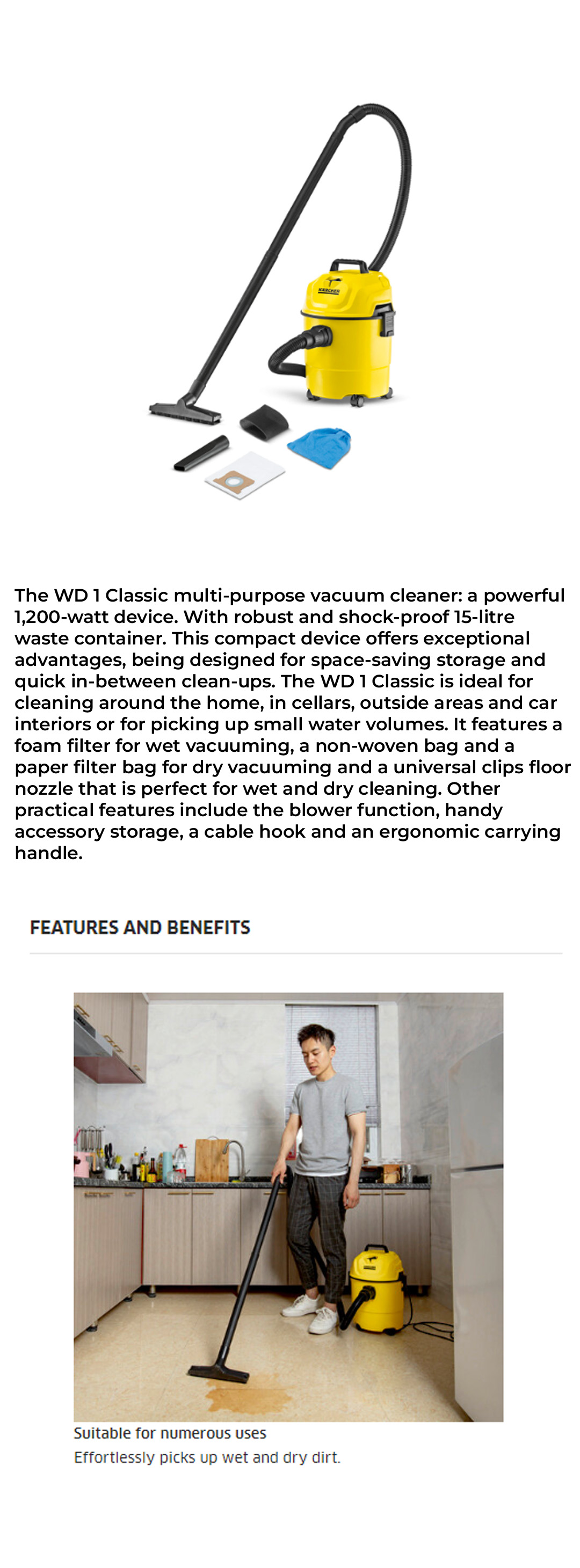 Karcher 1300W Wet & Dry Vacuum Cleaner WD 1s Classic | Suitable for Numerous Uses | Foam Filter | Blower Function | Vacuum Cleaner with 1 Year Warranty