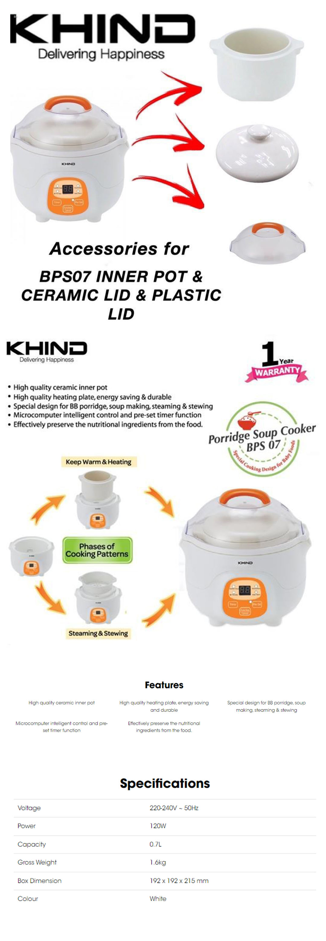 KHIND 0.7L Porridge Soup Cooker BPS07 | High Quality Ceramic Inner Pot | Microcomputer Intelligent Control and Pre-set Timer Function | Porridge Cooker with 1 Year Warranty