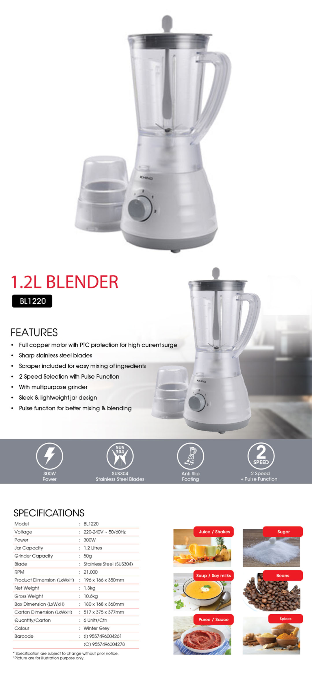 KHIND 1.2L Blender BL1220 | Power 300W | 2 Speeds + Pulse Function | Stainless Steel Blades | Anti Slip Foot | Blender with 1 Year Waranty