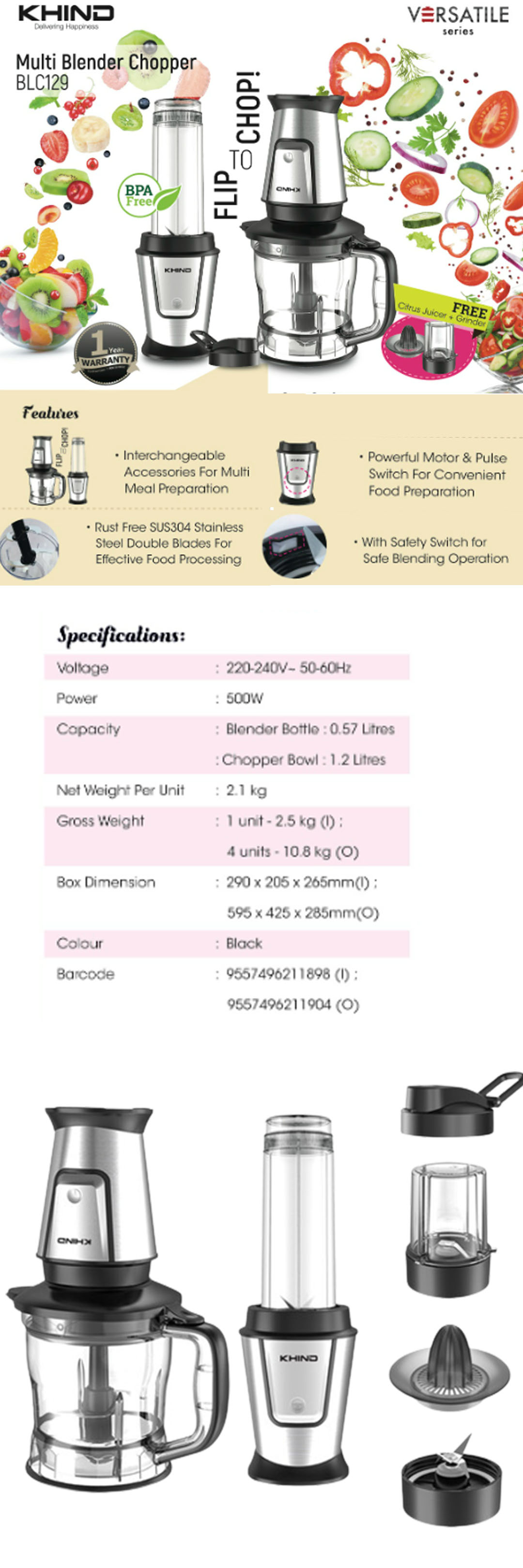 KHIND 1.2L Multi Blender Chopper BLC129 | FREE Citrus Juicer + Grinder | BPA Free | Rust Free SUS304 Stainless Steel Double Blades | Multi Blender Chopper with 1 Year Warranty