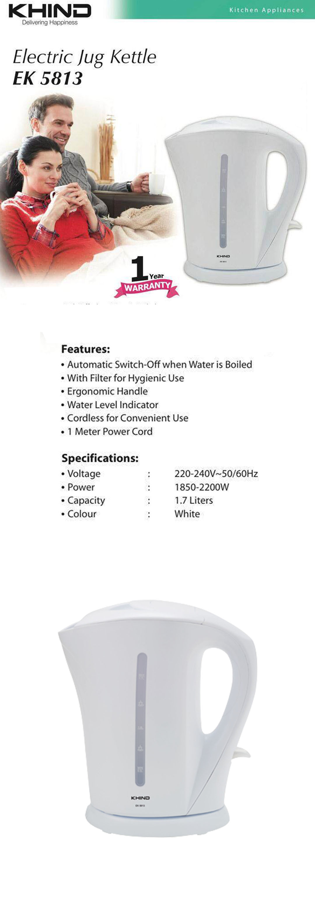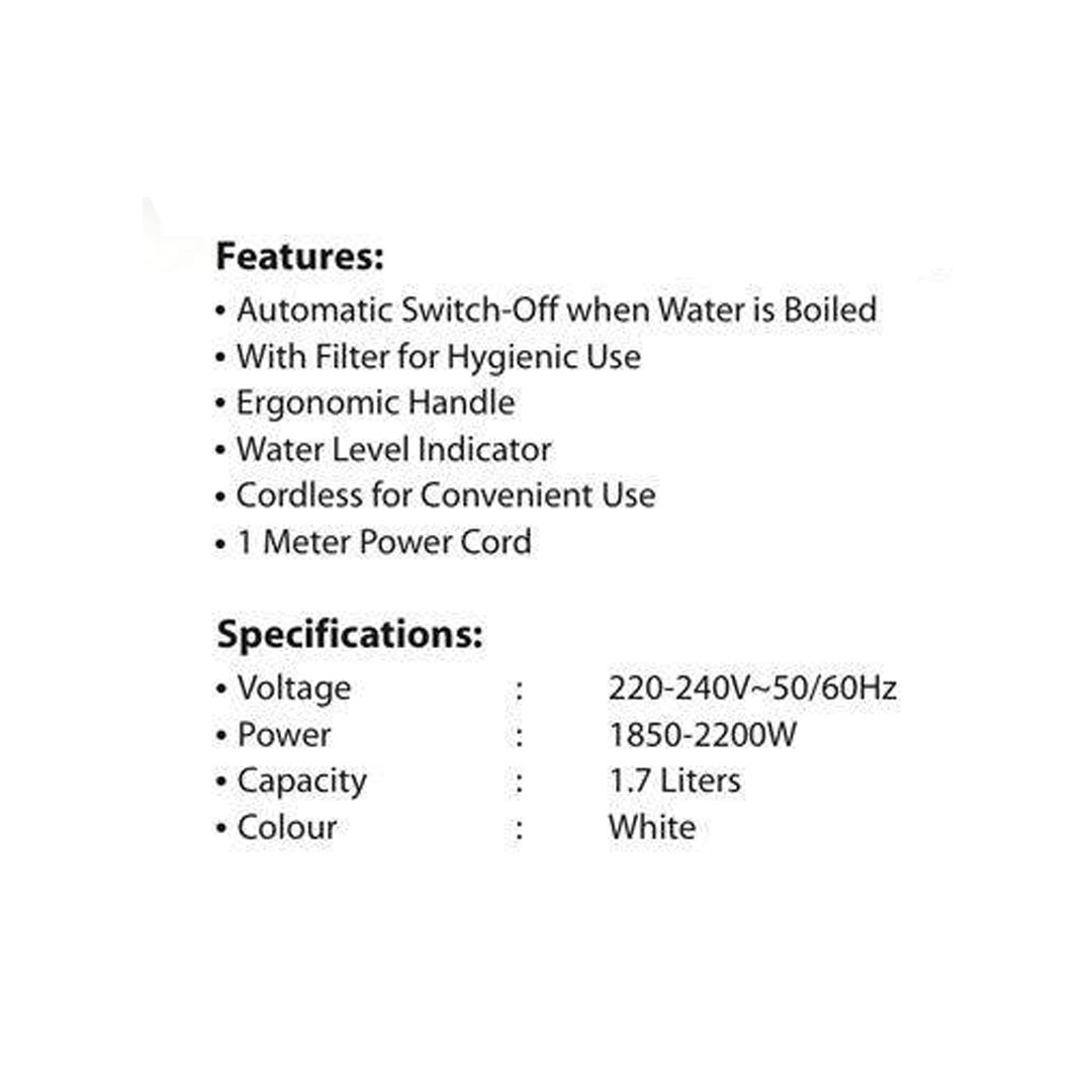KHIND 1.7L Electric Jug Kettle EK5813 | Automatic Switch-Off | Ergonomic Handle | Water Level Indicator | 1 Meter Power Cord | Kettle with 1 Year Warranty