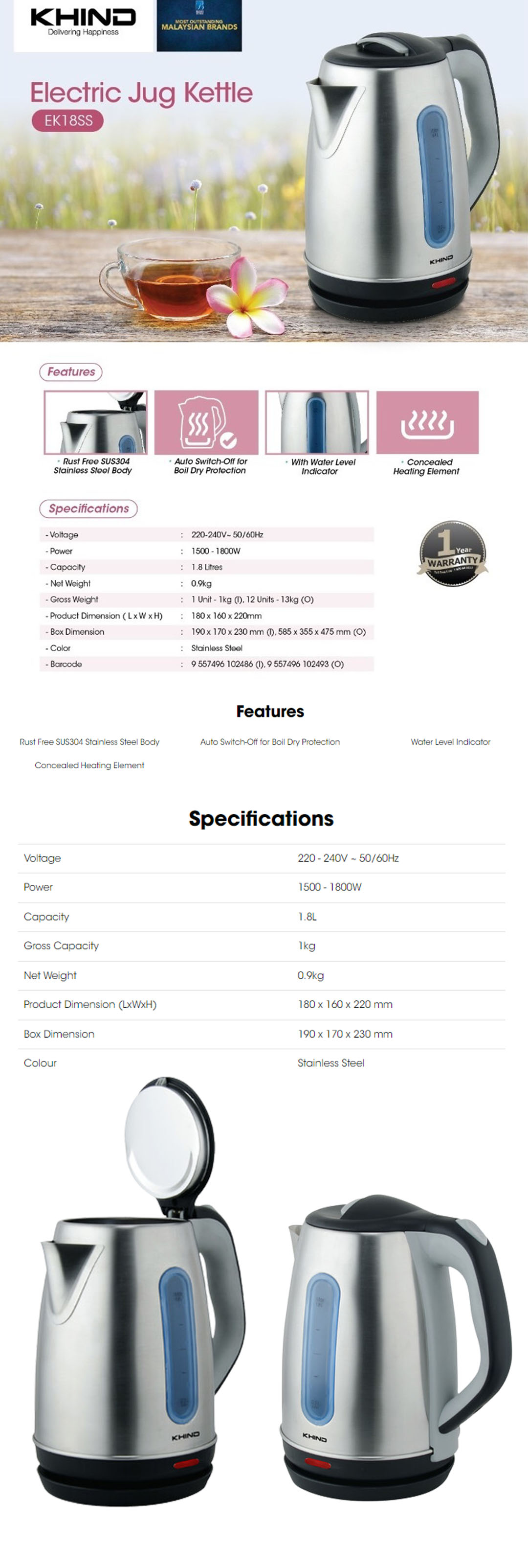 KHIND 1.8L Electric Jug Kettle EK18SS | Rust Free SUS304 Stainless Steel Body | Auto Switch-Off for Boil Dry Protection | Concealed Heating Element | Kettle with 1 Year Warranty