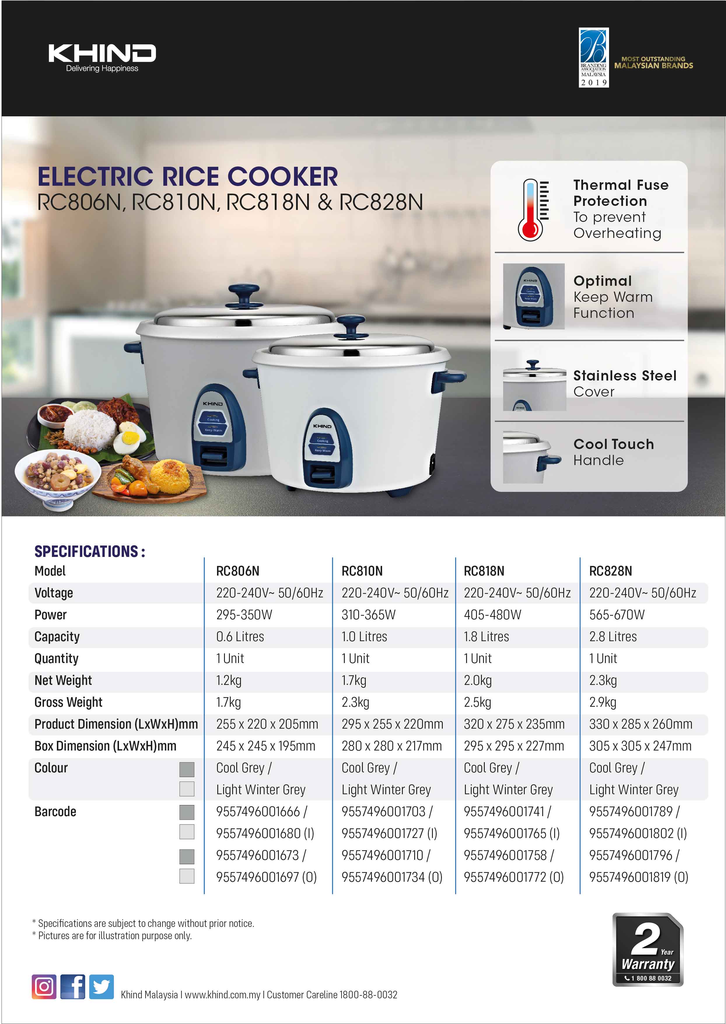 KHIND 1.8L Rice Cooker RC818N | Optimal Keep Warm Function | Thermal Fuse Protection to Prevent Overheating | Stainless Steel Cover | Rice Cooker with 2 Year Warranty