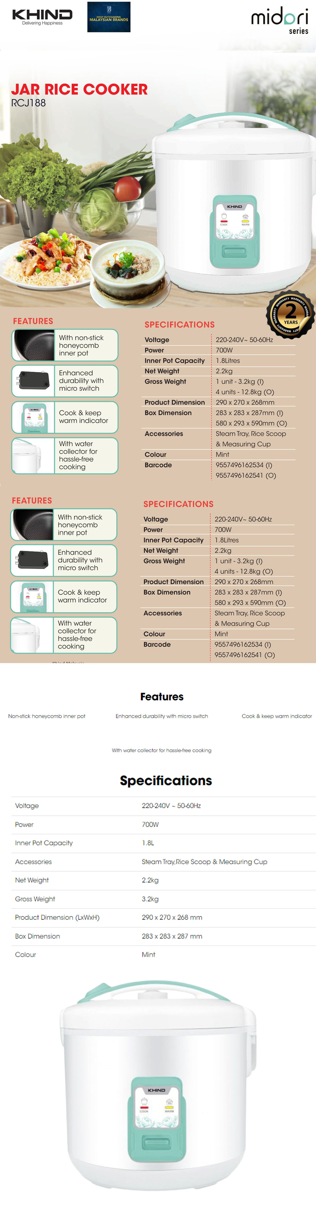 KHIND 1.8L Rice Cooker RCJ188 | Non-stick Honeycomb Inner Pot | Enhanced Durability with Micro Switch | Cook & Keep Warm Indicator | Rice Cooker with 2 Years Warranty
