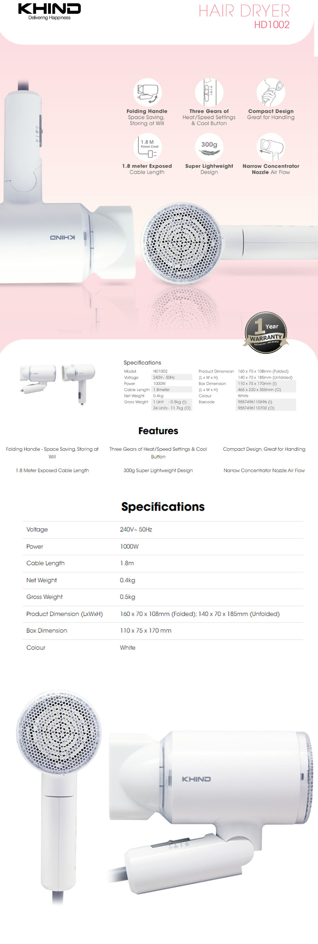 KHIND 1000W Hair Dryer HD1002 | Folding Handle - Space Saving, Storing at Will | Three Gears of Heat/Speed Settings & Cool Button | 1.8 Meter Exposed Cable Length | Hair Dryer with 1 Year Warranty