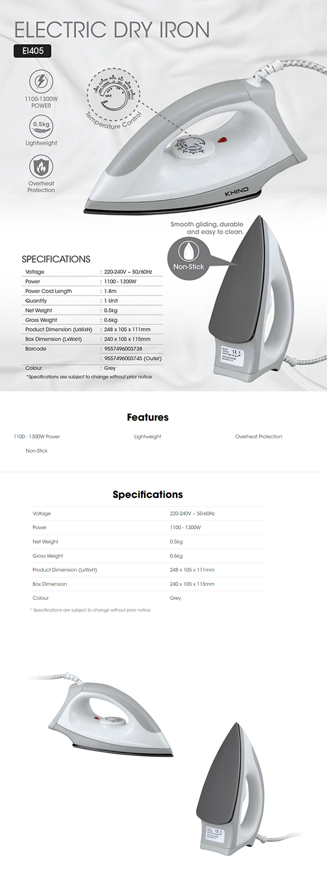 KHIND 1300W Electric Dry Iron EI40 | Overheat Protection | Lightweight | Non-Stick | Dry Iron with 1 Year Warranty