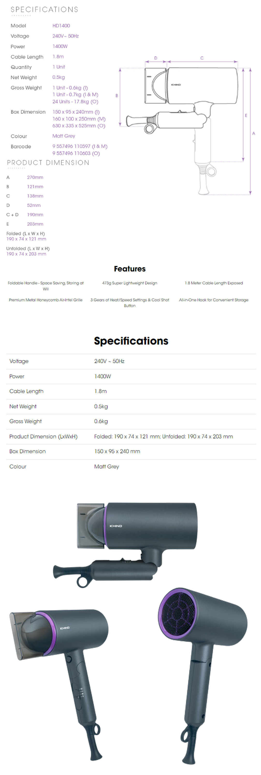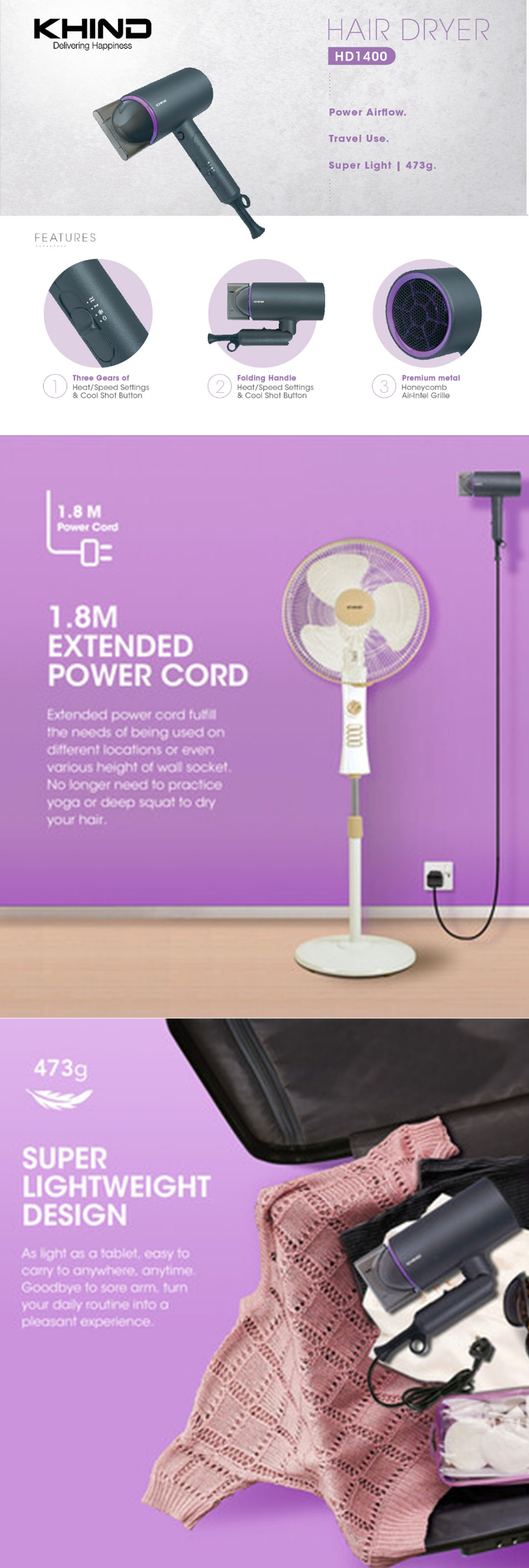 KHIND 1400W Hair Dryer HD1400 | Super Lightweight Design | 3 Gears of Heat/Speed Settings & Cool Shot Button | 1.8 Meter Cable Length Exposed | Hair Dryer with 1 Year Warranty
