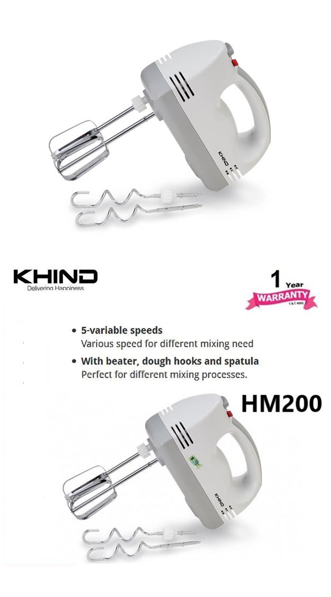 KHIND 160W Hand Mixer HM200 | 5 Variable Speeds | With Beater, Dough Hooks and Spatula | Hand Mixer with 1 Year Warranty