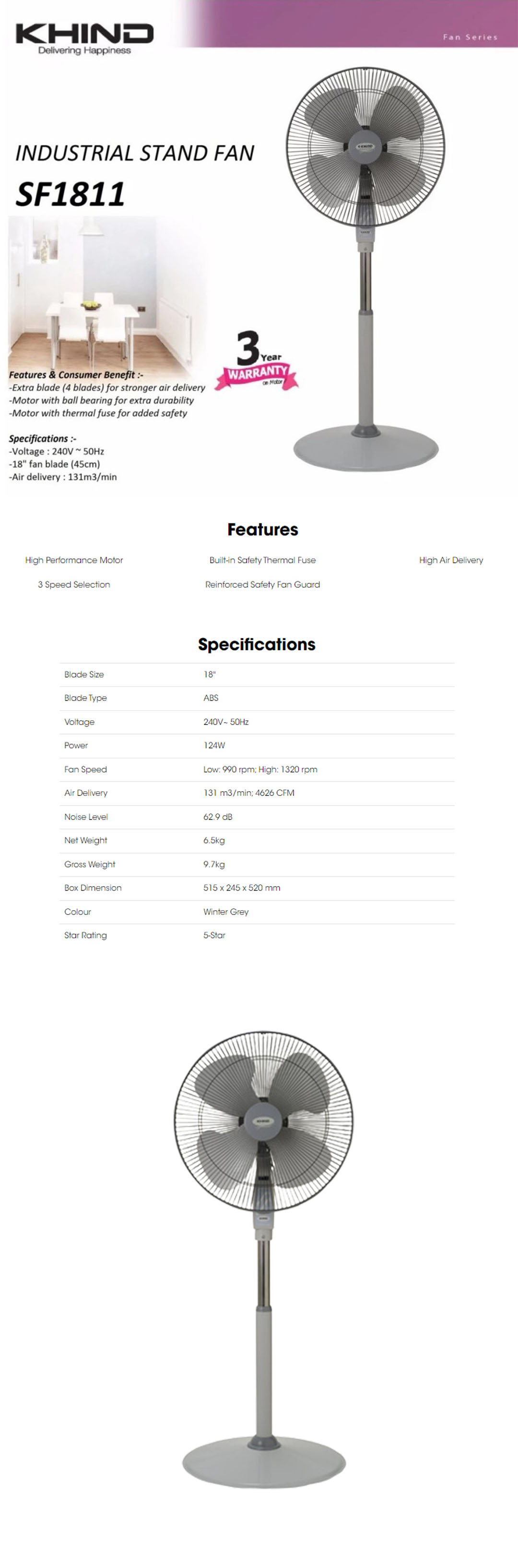 KHIND 18" Industrial Stand Fan SF1811 | Built-in Safety Thermal Fuse | 3 Speed Selection | High Air Delivery | Stand Fan with 1 Year General Warranty & 3 Years Motor Warranty